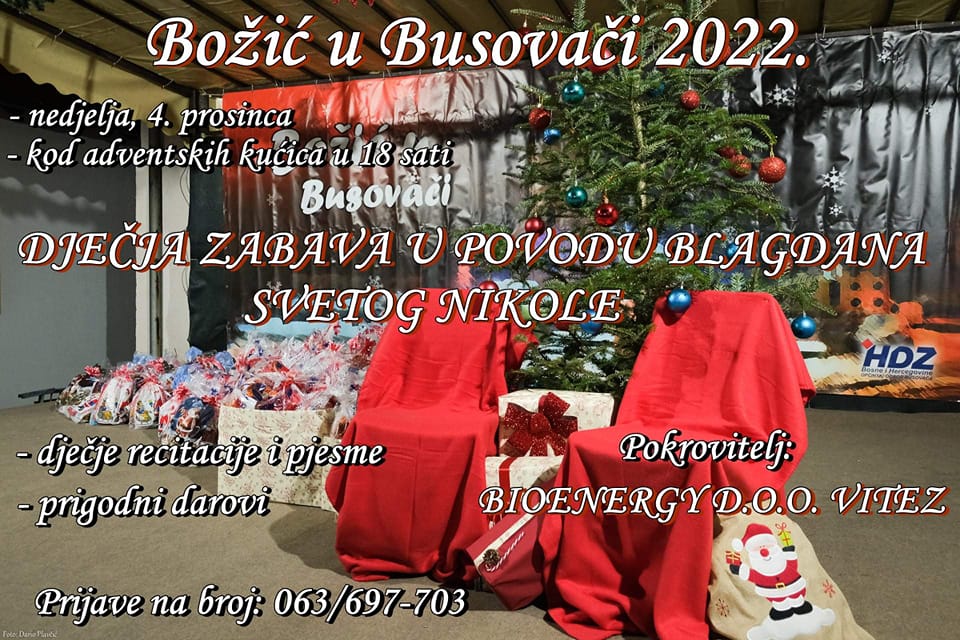 U nedjelju, 4. prosinca u 18.00 sati kod adventskih kućica, u sklopu manifestacije “Božić u Busovači”, bit će organizirana Dječja zabava u povodu blagdana sv. Nikole na kojoj će naši najmlađi recitirati i pjevati.