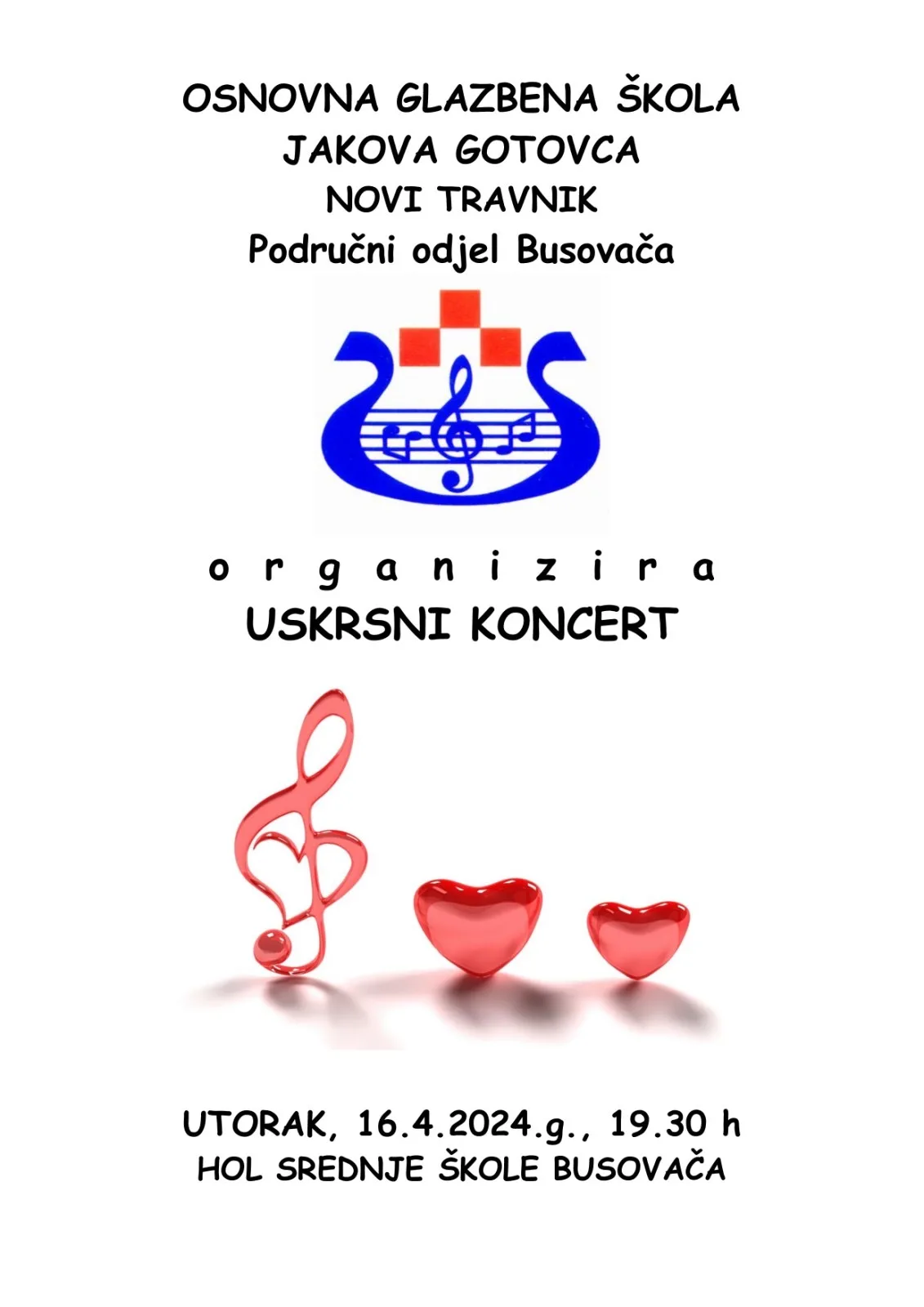 Osnovna Glazbena Škola Jakova Gotovca u Busovači s ponosom najavljuje svoj tradicionalni Uskrsni koncert koji će se održati sutra, 16. travnja 2024. godine. Koncert započinje u 19:30 sati i održat će se u holu Srednje škole “Busovača”.