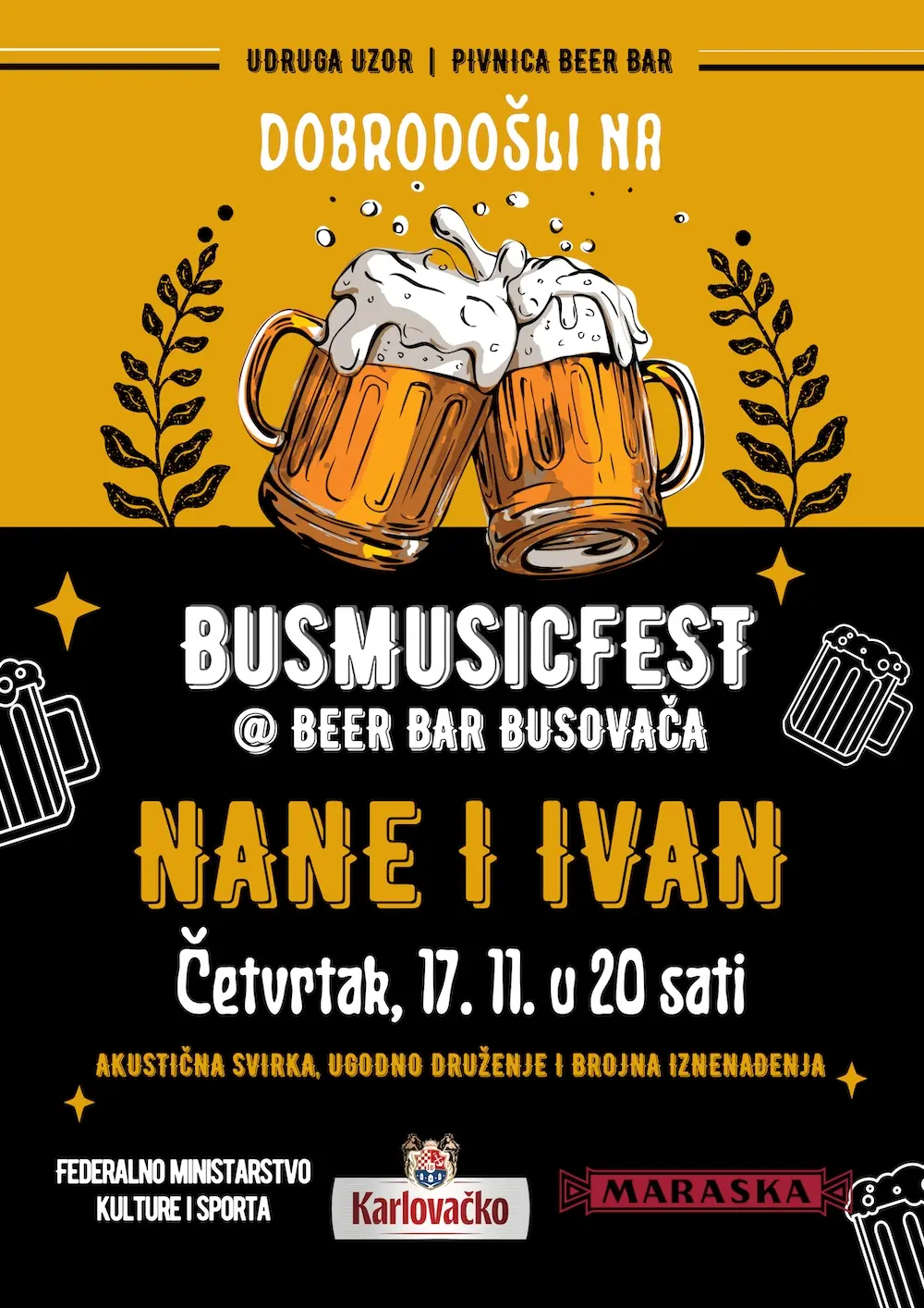 Nakon sjajnog otvorenja, a potom i svirki bendova “BBrothers” i “Dva i po Č’oeka”, program BusMusicFest-a nastavlja se ovaj tjedan svirkom acoustic dua “Nane i Ivan”. Svirka je na rasporedu u četvrtak, 17. 11. 2022. godine, s početkom u 20 sati.