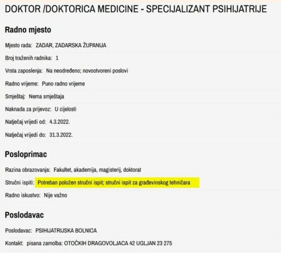 U oglasu je navedeno kako se traži doktor ili doktorica medicine za mjesto specijalizanta psihijatrije u psihijatrijskoj bolnici u Ugljanu, no uvjeti koje poslodavac zahtijeva od potencijalnog budućeg zaposlenika nisu ono što biste inače očekivali.