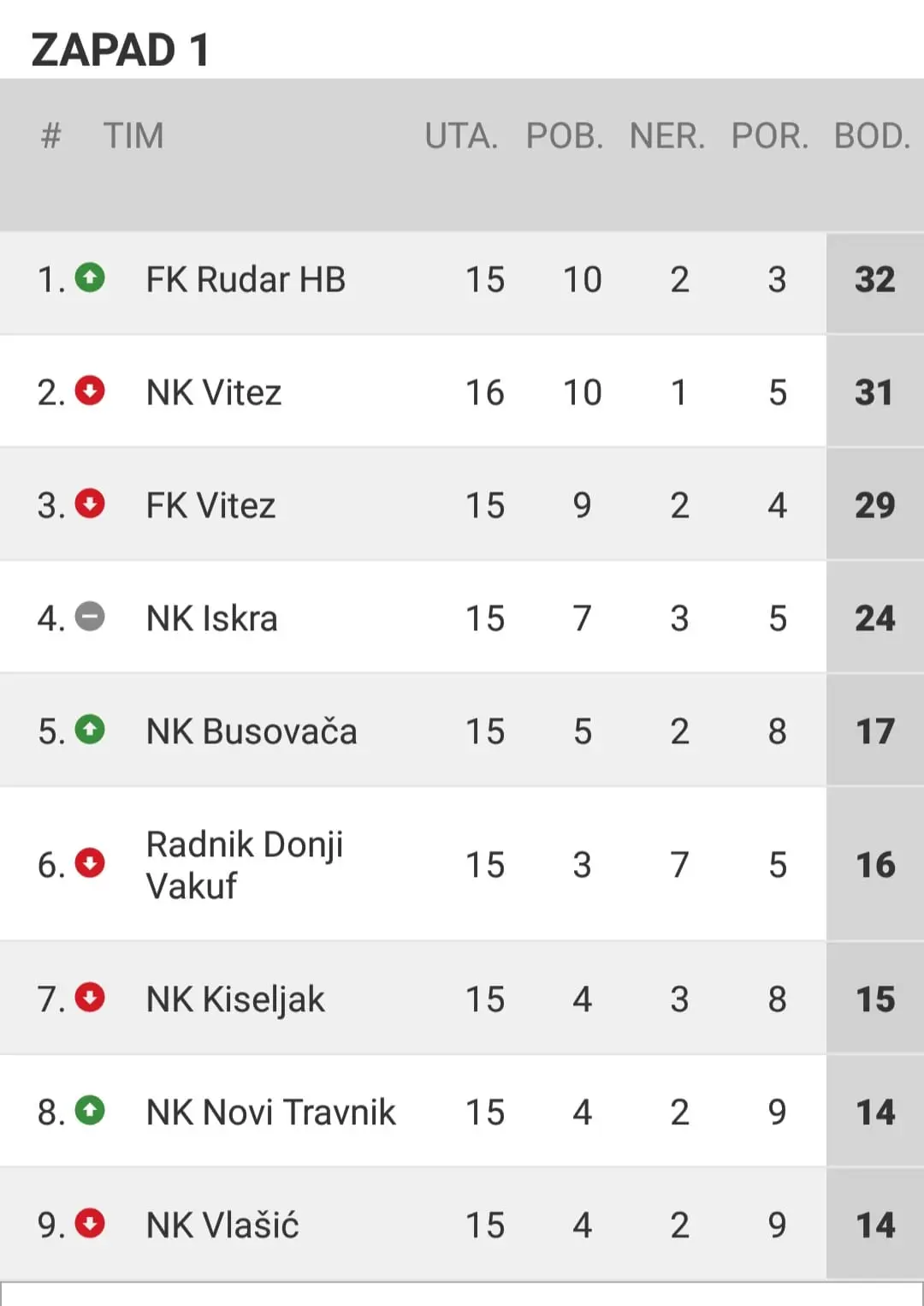 Pogledajte stanje na tabeli nakon odigranog 15. kola: