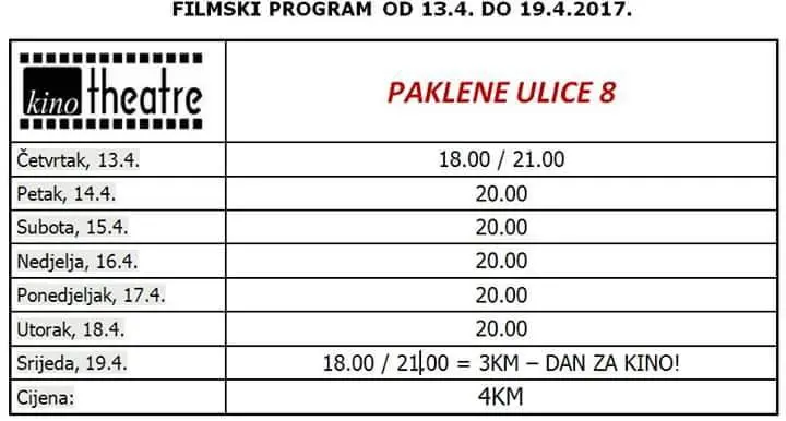 Sve informacije i rezervacije za filmove možete izvršiti preko Facebook stranice kina Theatre, putem maila kinotheatre@gmail.com ili na broj telefona 063/799-267.
