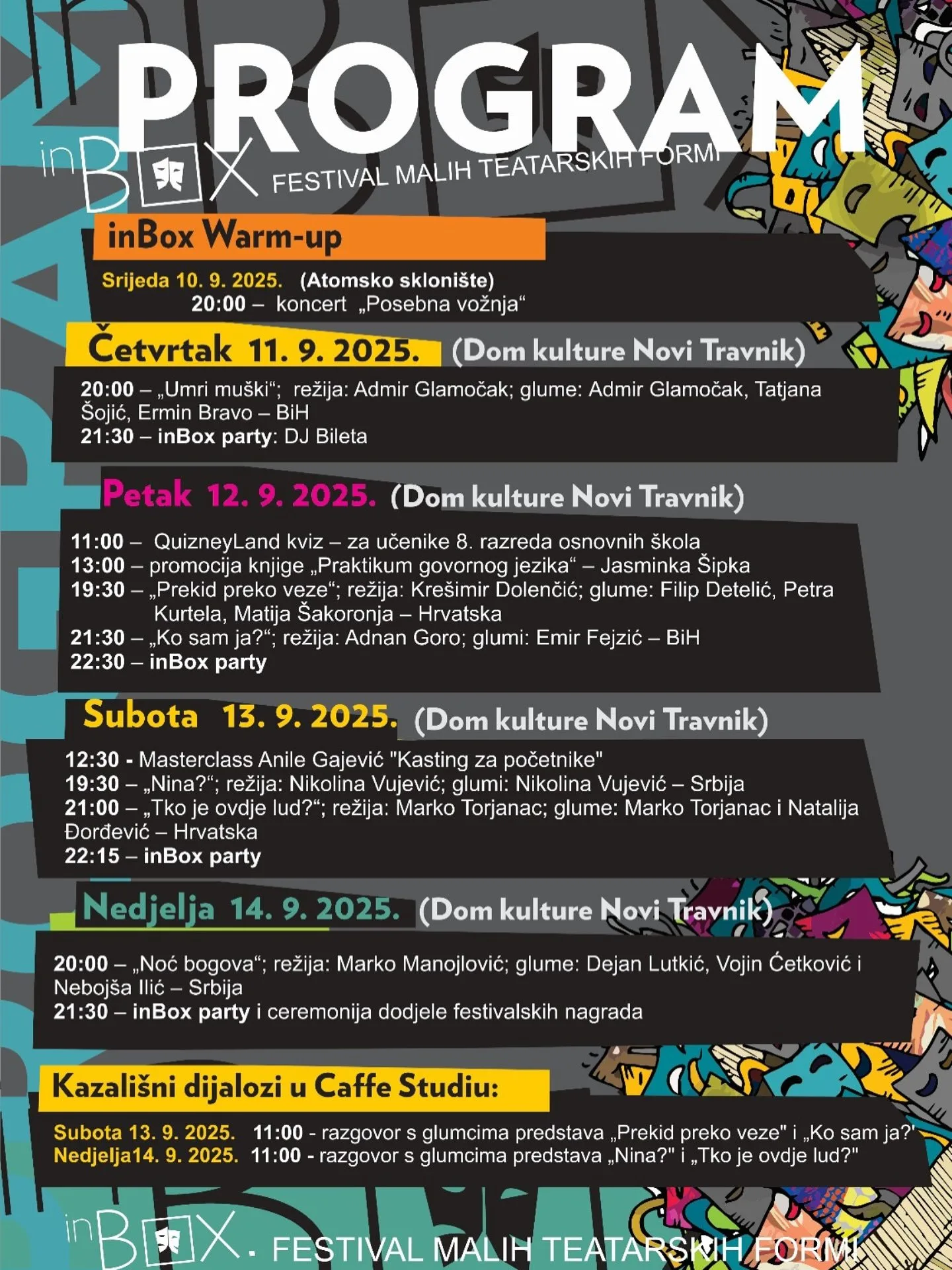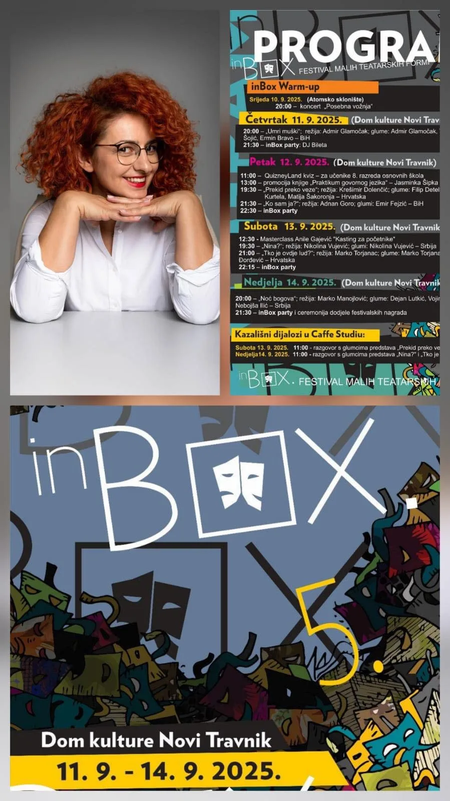 Festival započinje u srijedu, 10. rujna, koncertom benda Posebna vožnja u Atomskom skloništu, dok će se od četvrtka do nedjelje sva zbivanja odvijati u Domu kulture Novi Travnik. Publiku očekuje niz predstava, od humorističnih do dramskih, kvizovi, promocije knjiga, masterclass radionice, razgovori s glumcima te večernji inBox partyji.