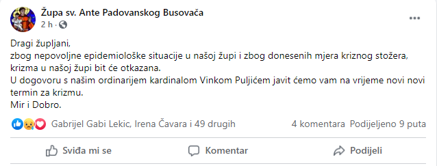 “Dragi župljani, zbog nepovoljne epidemiološke situacije u našoj župi i zbog donesenih mjera kriznog stožera, krizma u našoj župi bit će otkazana.