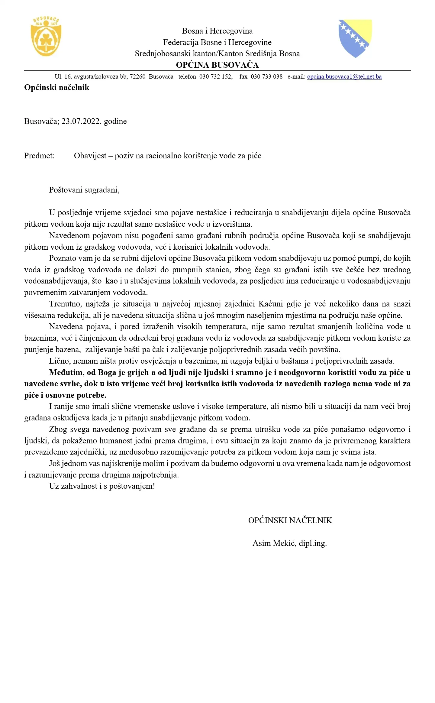 molimo da na Vašem i našem portalu objavite Obavijest – poziv za racionalno trošenje vode za piće koje je građanima Busovače uputio načelnik Općine Busovača, gospodin Asim Mekić.”