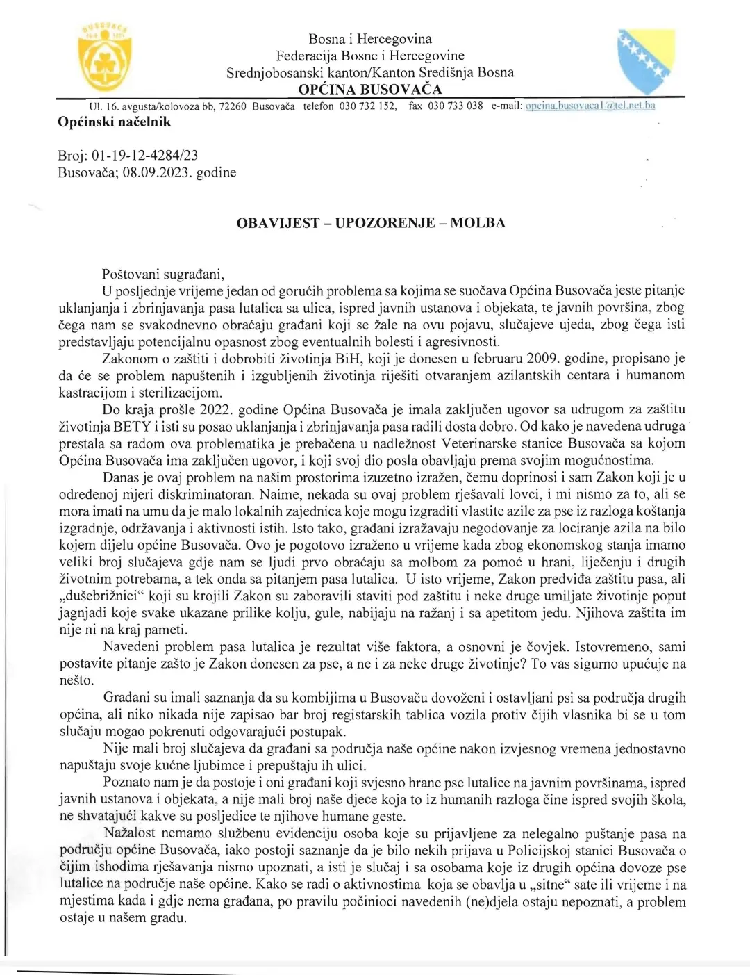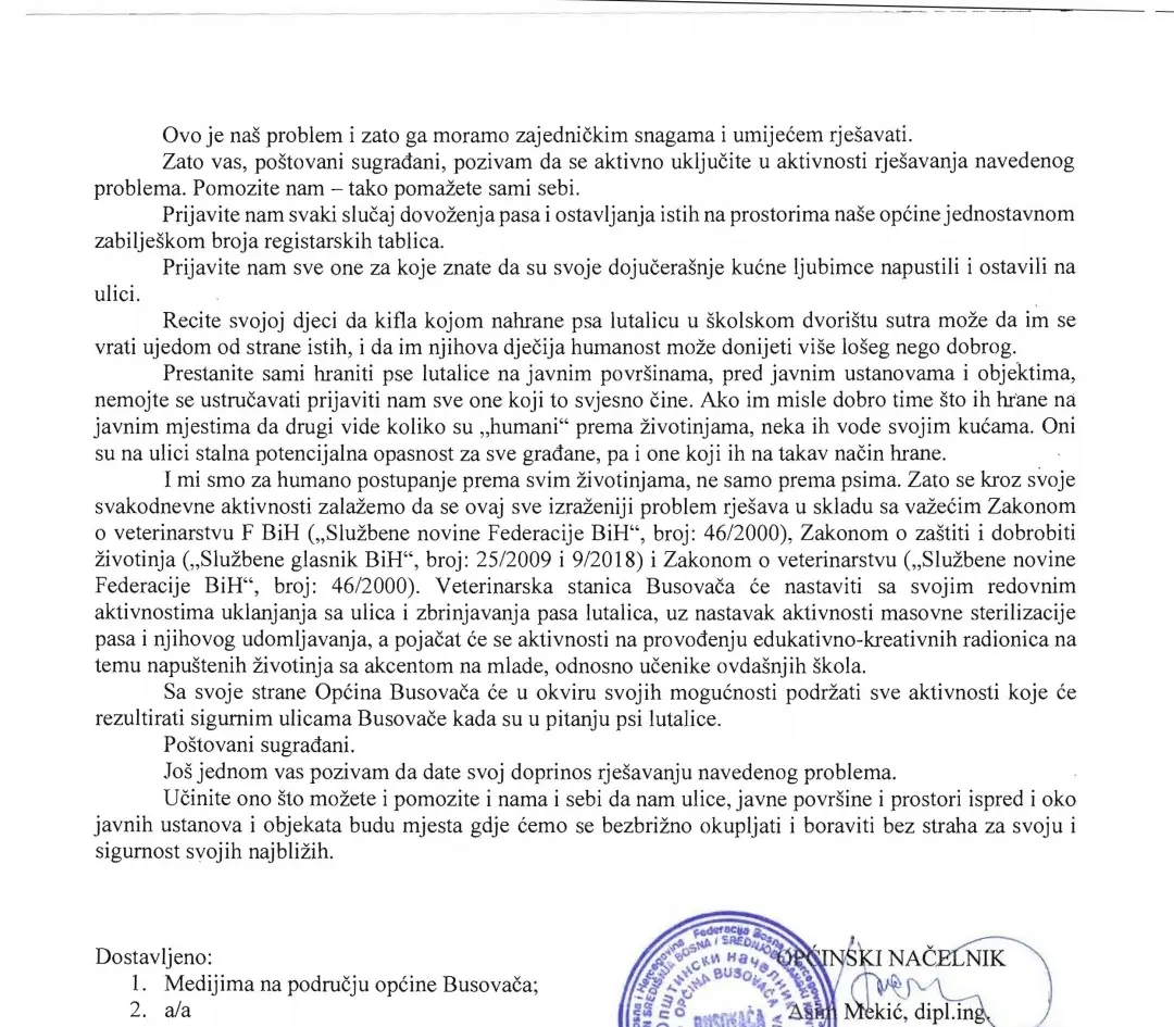 Na redakcijski e mail stigla nam je OBAVIJEST – UPOZORENJE – MOLBA načelnika općine Busovača gospodina Asima Mekića, vezano za jedan od gorućih problema s kojima se suočava općina Busovača, pitanje uklanjanja i zbrinjavanja pasa lutalica s ulica.