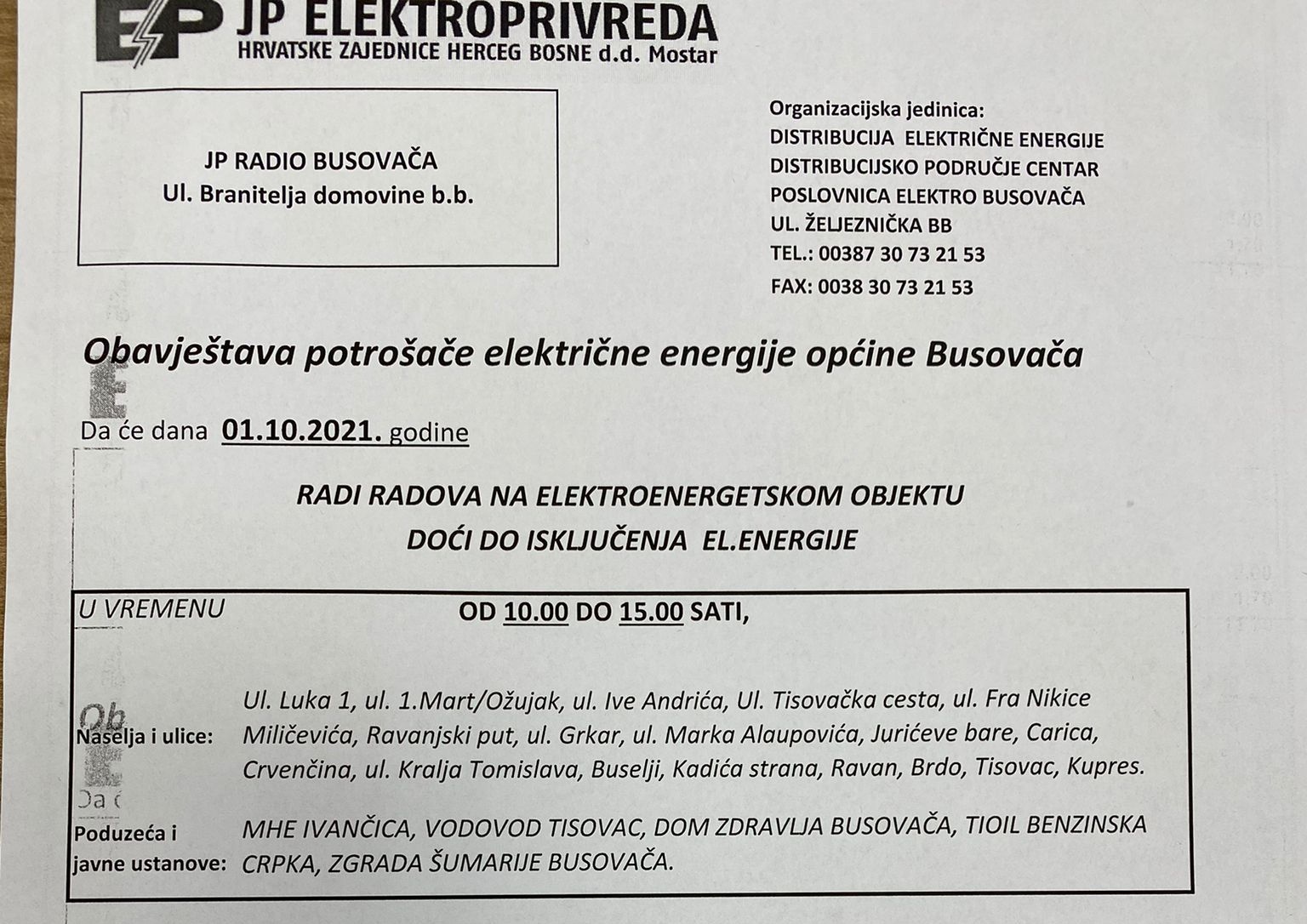 JP “Elektroprivreda”, poslovnica Elektro Busovača obavještava potrošače električne energije općine Busovača da će dana 1. listopada, radi radova na elektroenergetskom objektu, doći do isključenja električne energije u vremenu od 10:00 do 15:00 sati, u sljedećim mjestima: