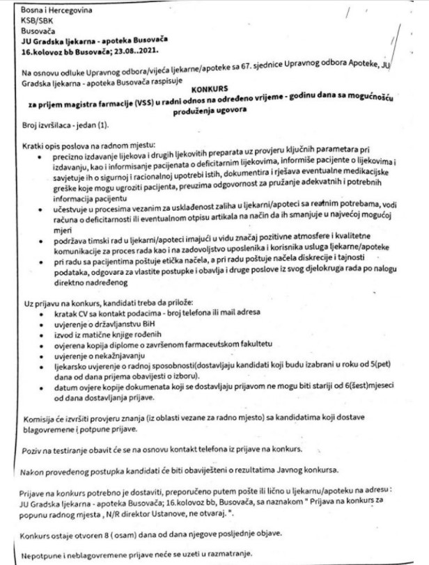 Gradska ljekarna Busovača raspisala je javni oglas za prijam magistra farmacije (VSS) u radni odnos na određeno vrijeme – godinu dana s opcijom produljenja ugovora. Oglas je objavljen 23. kolovoza i ostaje otvoren osam dana od dana objave.
