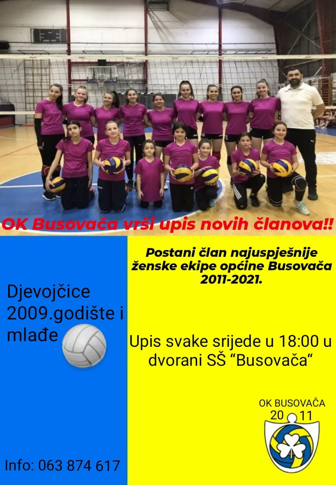 Upis je predviđen za djevojčice godišta 2009. i mlađe, a vrši se svake srijede u sportskoj dvorani Srednje škole “Busovača” u 18 sati.4