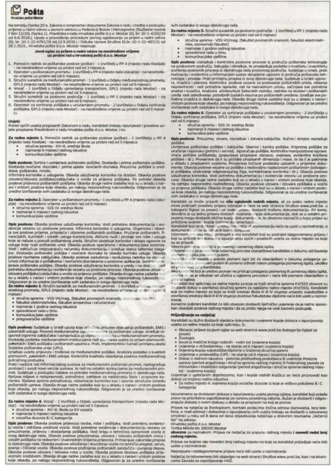 Hrvatska pošta d.o.o. Mostar raspisala je oglas za prijam djelatnika u radni odnos, a dva radna mjesat su u Županiji Središnja Bosna, i to jedno u Kiseljaku, a drugo u Uskoplju.