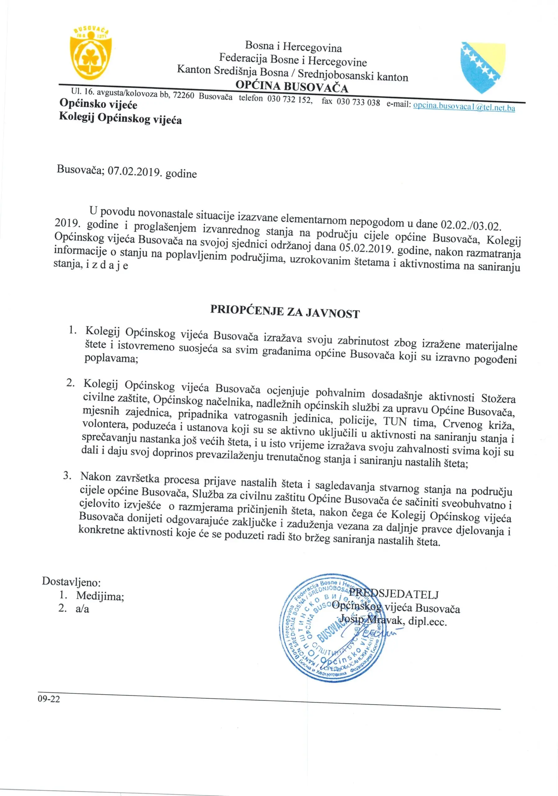 Općinsko vijeće Busovača: Priopćenje za javnost nakon poplava u Busovači