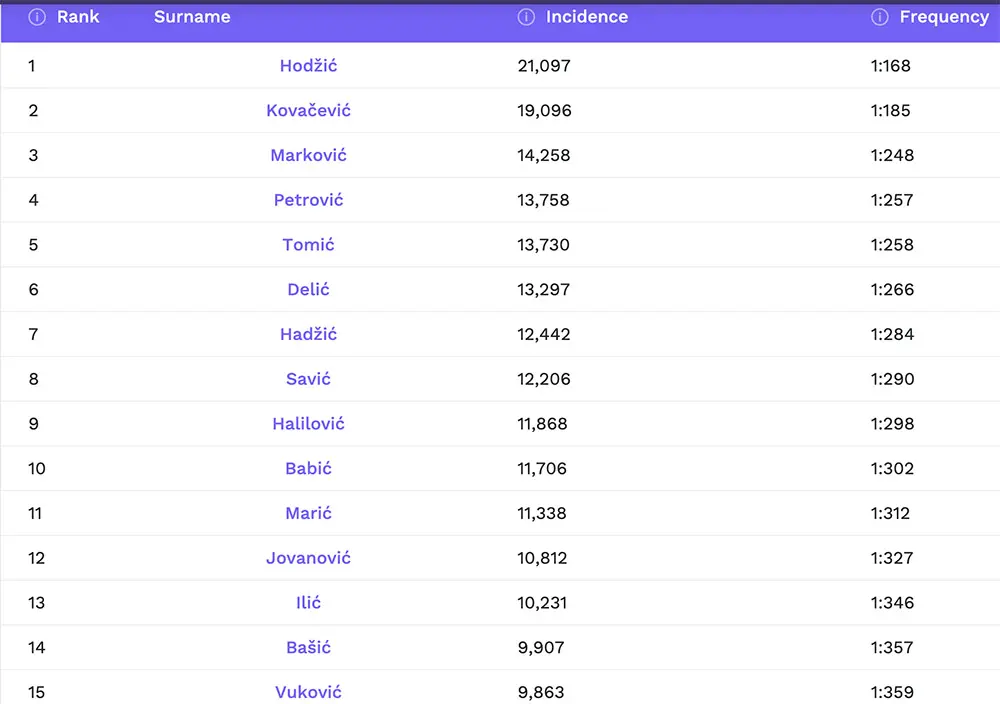 Na prvom mjestu je prezime Hodžić, koje nosi 21.097 ljudi, a slijede: Kovačević (19.096), Marković (14.258), Petrović (13.758), Tomić (13.730), Delić (13.297), Hadžić (12.442), Savić (12.206), Halilović (11.868) i Babić (11.706).