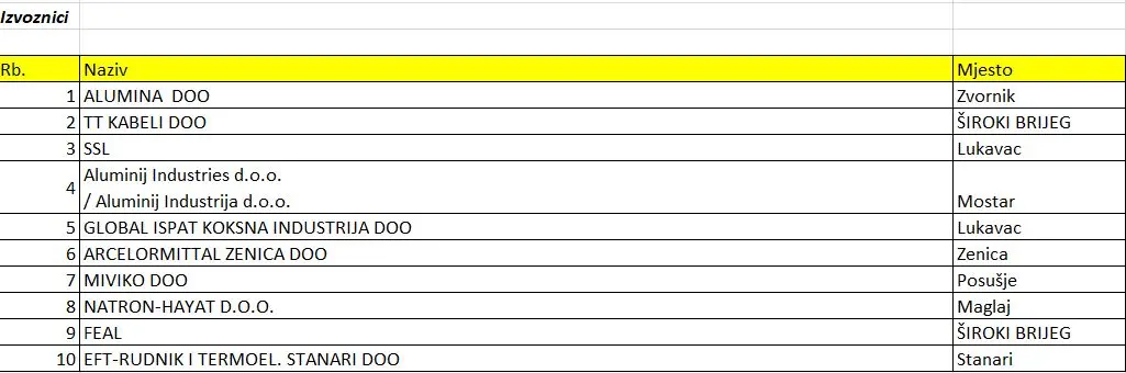 Na prvom mjestu se našla kompanija Alumina d.o.o., dok iza nje dalje slijedi kompanija TT KABELI d.o.o. Široki Brijeg. Kompanija ArcelorMittal koja je prošlu godinu završila kao najveći izvoznik ovaj put se našla na šestom mjestu.