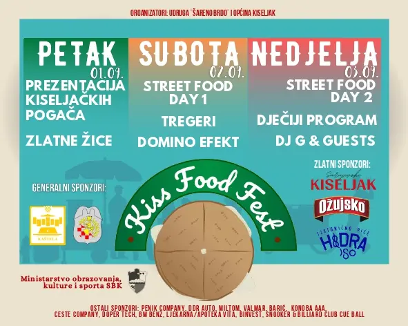 Udruga “Šareno brdo” i ove godine organizira Kiss Food Fest, čiji je cilj promidžba gastro – scene Kiseljaka, mjesta koje je već desetljećima poznato po dobroj hrani i piću. Ovogodišnji festival trajat će tri dana, od 1. do 3. rujna 2023. godine te će biti smješten na Trgu kneza Radoje u Kiseljaku. O uspjehu prošlogodišnjeg festivala još uvijek se govori u ovom mjestu, a građani, kao i izlagači, se raduju ponovnoj prilici kušanja gastro kreacija. Događaj se organizira u suradnji s Općinom Kiseljak, a podržali su ga i poznati brendovi Sarajevski kiseljak d.o.o, Ožujsko pivo i Molson Coors BH d.o.o., Grad Kaštela (Republika Hrvatska), Ministarstvo obrazovanja, mladih, znanosti, kulture i sporta Srednjobosanske Županije te brojni drugi.
