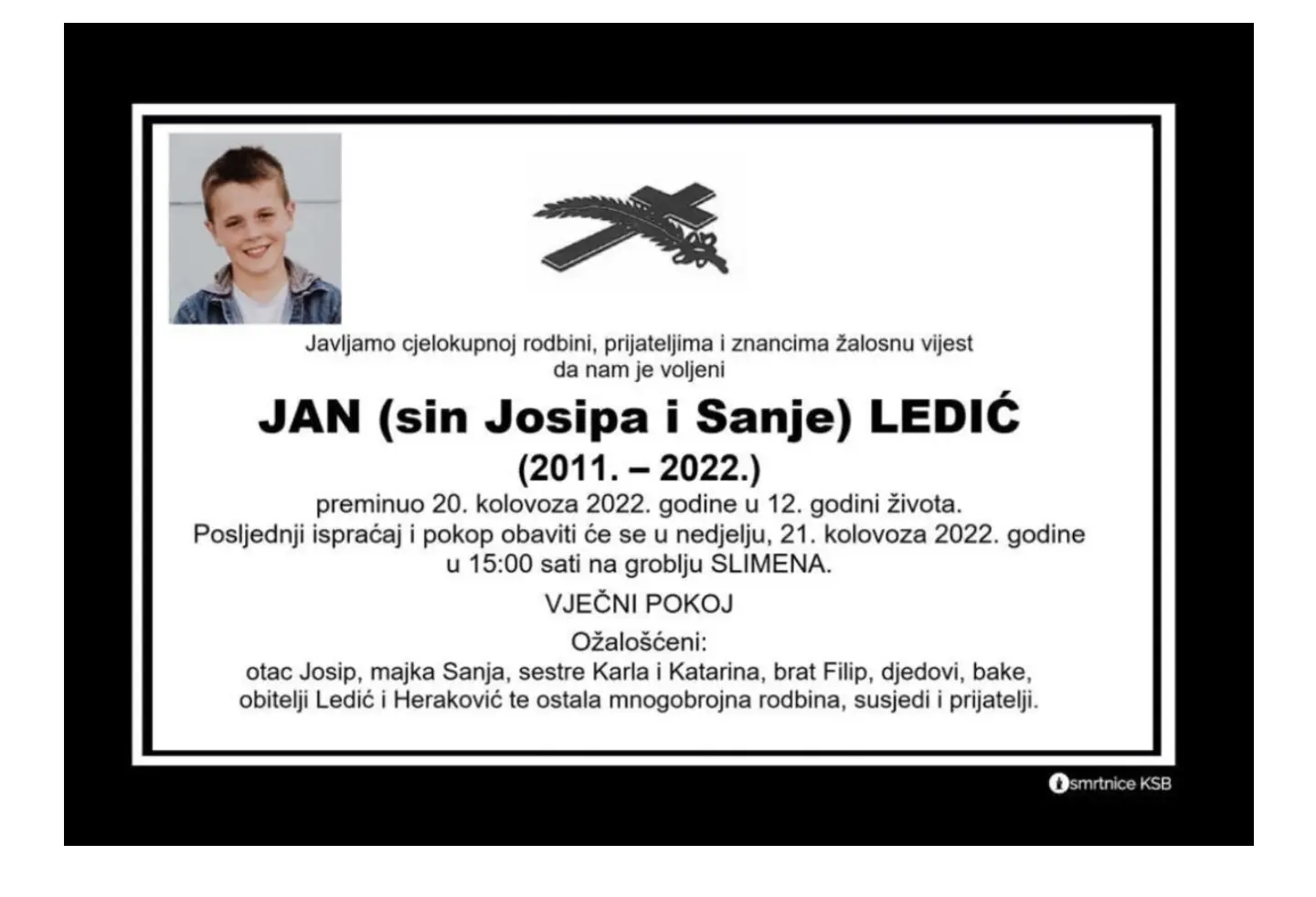 Ožalošćenoj obitelji, ocu Josipu, majci Sanji, sestrama Karli i Katarini, bratu Filipu, bakama i djedovima, kao i obiteljima Ledić i Heraković te mnogobrojnoj rodbini, susjedima i prijateljima upućujemo iskrene izraze sućuti.