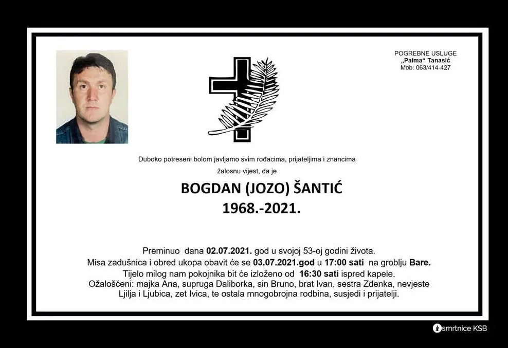 Misa zadušnica i obred ukopa obavit će se 3.7.2021. u 17:00 sati na groblju Bare. Tijelo milog pokojnika bit će izloženo od 16:30 ispred sati kapele.