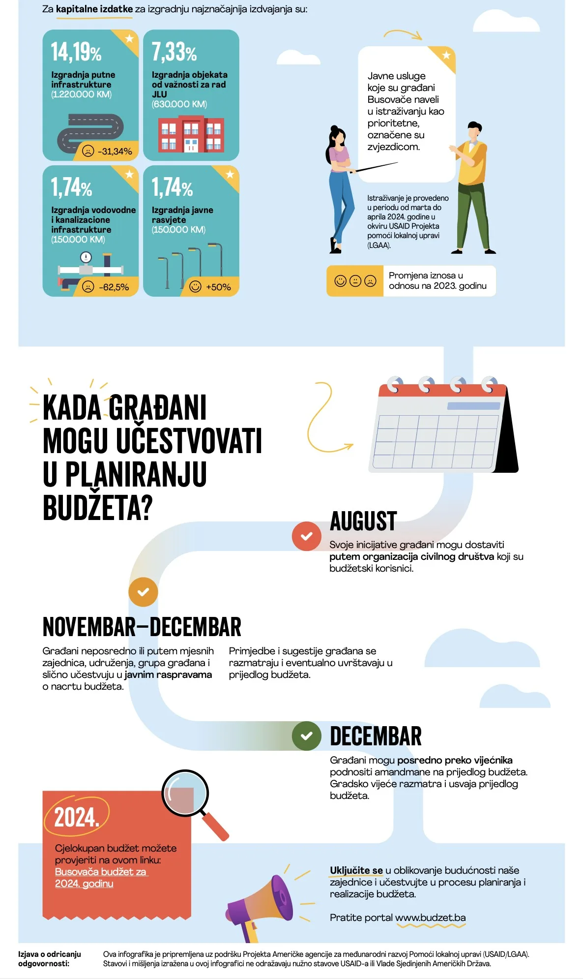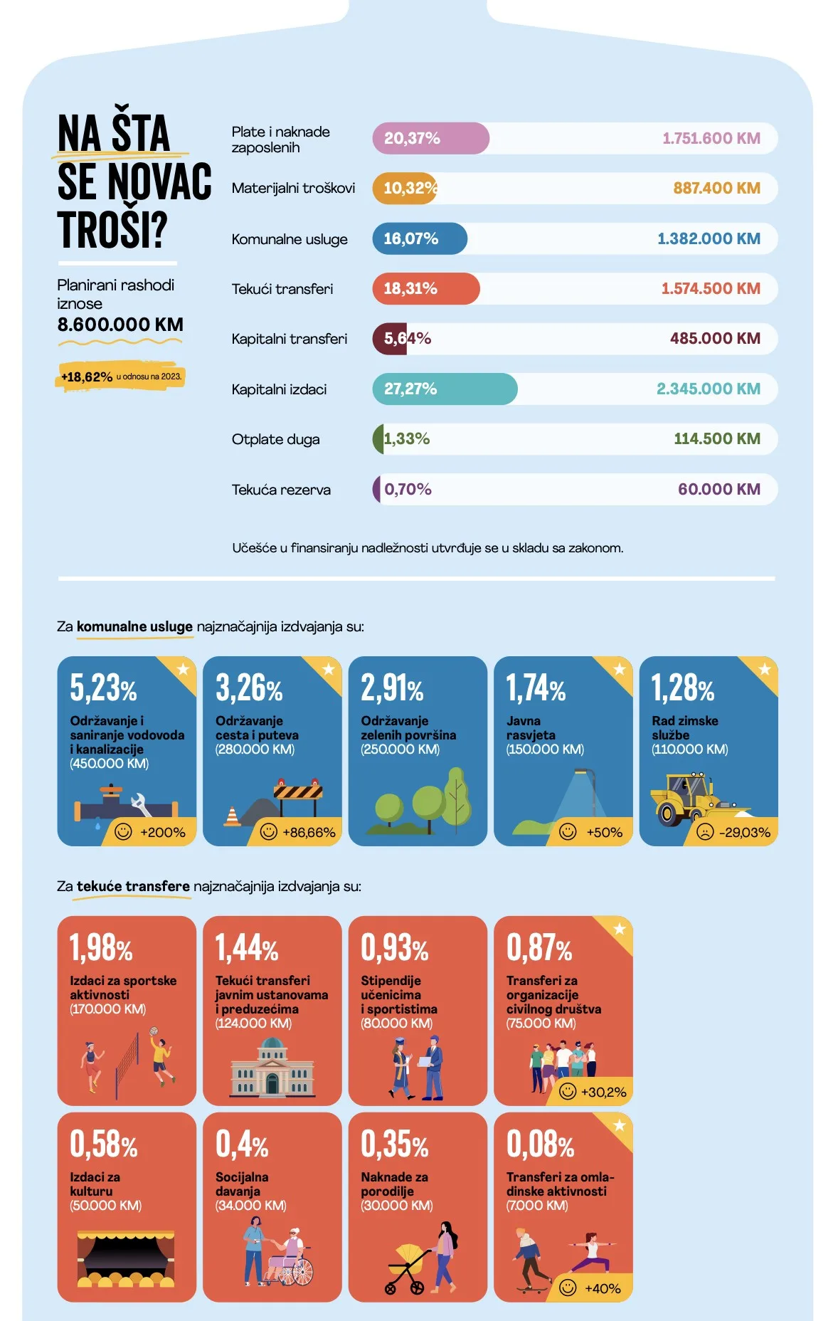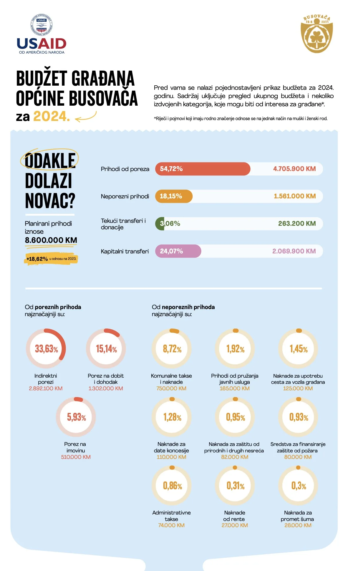 Pred vama se nalazi pojednostavljeni prikaz proračuna Općine Busovača za 2024. godinu. Sadržaj uključuje pregled ukupnog proračuna i nekoliko izdvojenih kategorija, koje mogu biti od interesa za građane*.