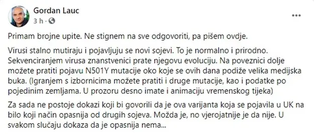 Za novi soj koronavirusa koji se pojavio u Velikoj Britaniji znanstvenik Gordan Lauc objavio je na Facebooku kako su mutacije normalne i prirodne. Navodi kako još uvijek nije poznato je li ova varijanta virusa opasnija od drugih sojeva. Sekvenciranjem virusa znanstvenici prate njegovu evoluciju, napisao je Gordan Lauc. Lauc dodaje i poveznicu na kojoj je moguće pratiti pojavu N501Y mutacije, oko koje se, kako je napisao, ovih dana podiže velika medijska buka.