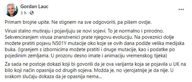 Za novi soj koronavirusa koji se pojavio u Velikoj Britaniji znanstvenik Gordan Lauc objavio je na Facebooku kako su mutacije normalne i prirodne. Navodi kako još uvijek nije poznato je li ova varijanta virusa opasnija od drugih sojeva. Sekvenciranjem virusa znanstvenici prate njegovu evoluciju, napisao je Gordan Lauc. Lauc dodaje i poveznicu na kojoj je moguće pratiti pojavu N501Y mutacije, oko koje se, kako je napisao, ovih dana podiže velika medijska buka.