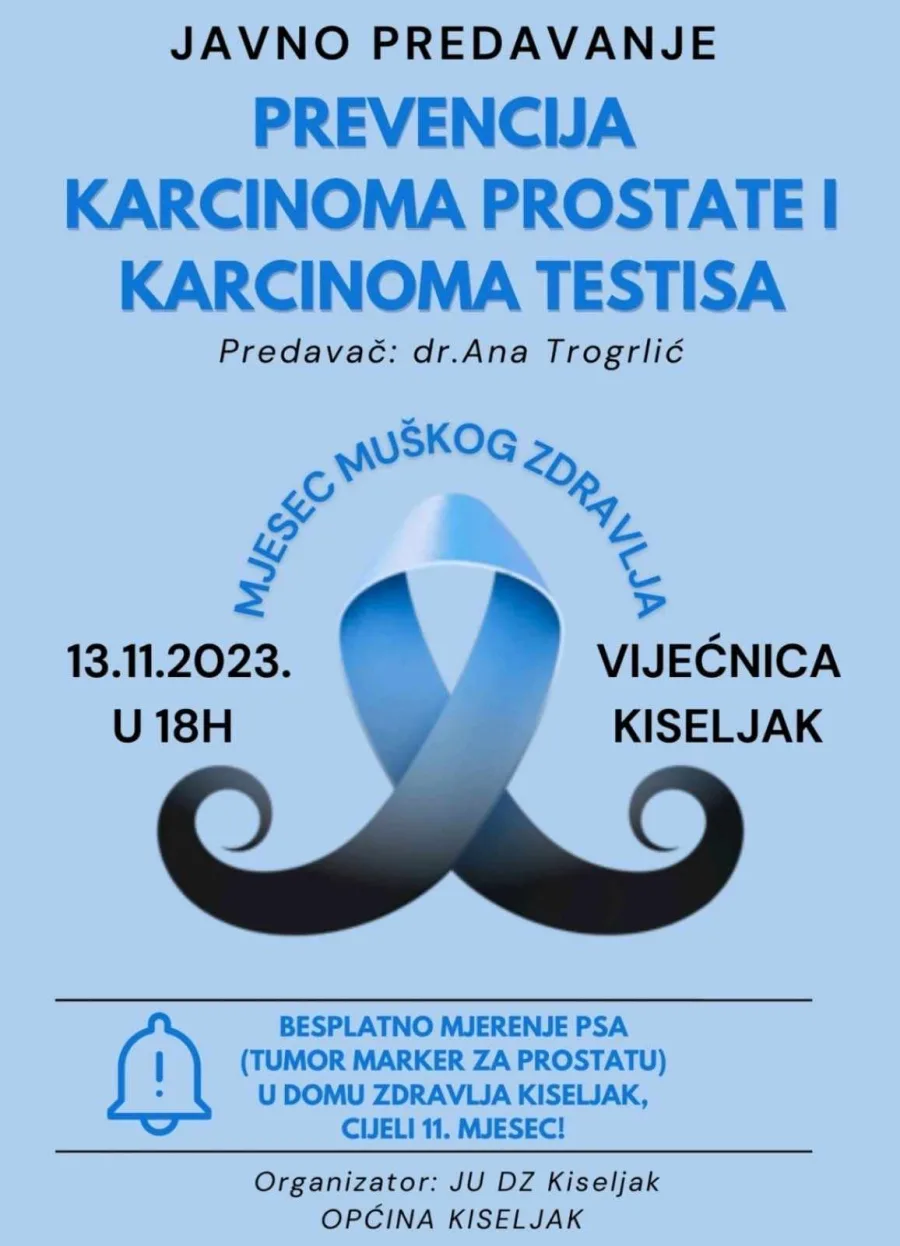 S obzirom kako je studeni mjesec podizanja svijesti o muškom zdravlju, u organizaciji JU Dom zdravlja Kiseljak, a uz potporu Općine Kiseljak, održat će se javno predavanje na temu: “Prevencija karcinoma prostate i karcinoma testisa.”