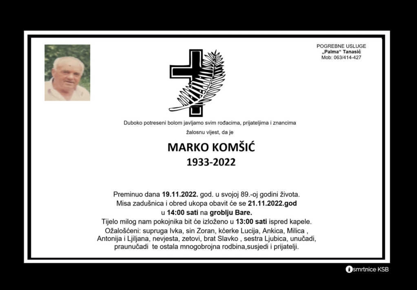 Duboko potreseni bolom javljamo svim rođacima, prijateljima i znancima žalosnu vijest da je Marko Komšić