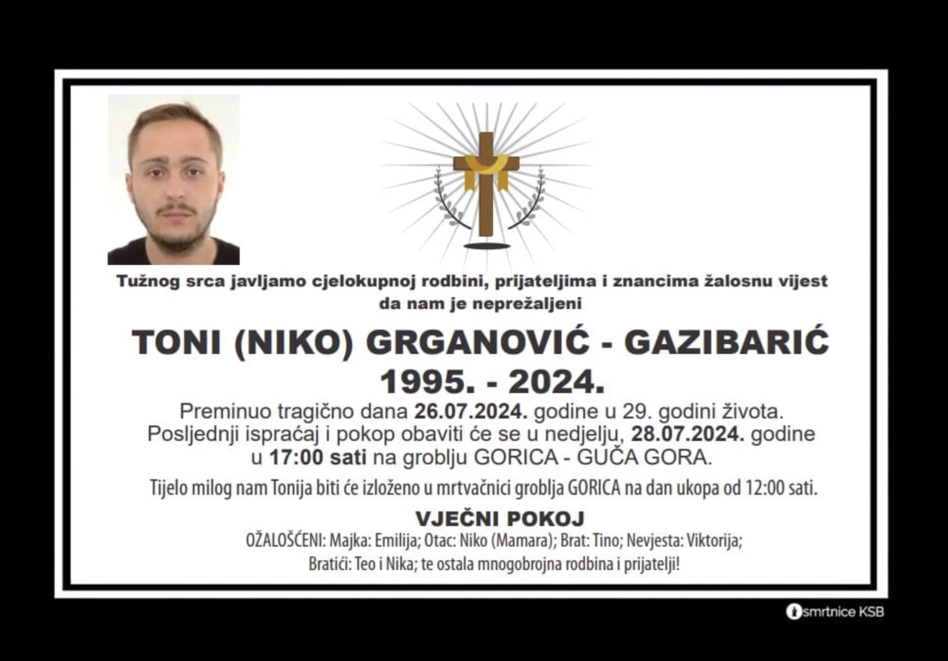 Posljednji ispraćaj i ukop mladića obavit će se danas u 17 sati na mjesnom groblju Gorica u Gučoj Gori. Njegovo tijelo bit će izloženo u mrtvačnici Gorica na dan ukopa od 12:00.