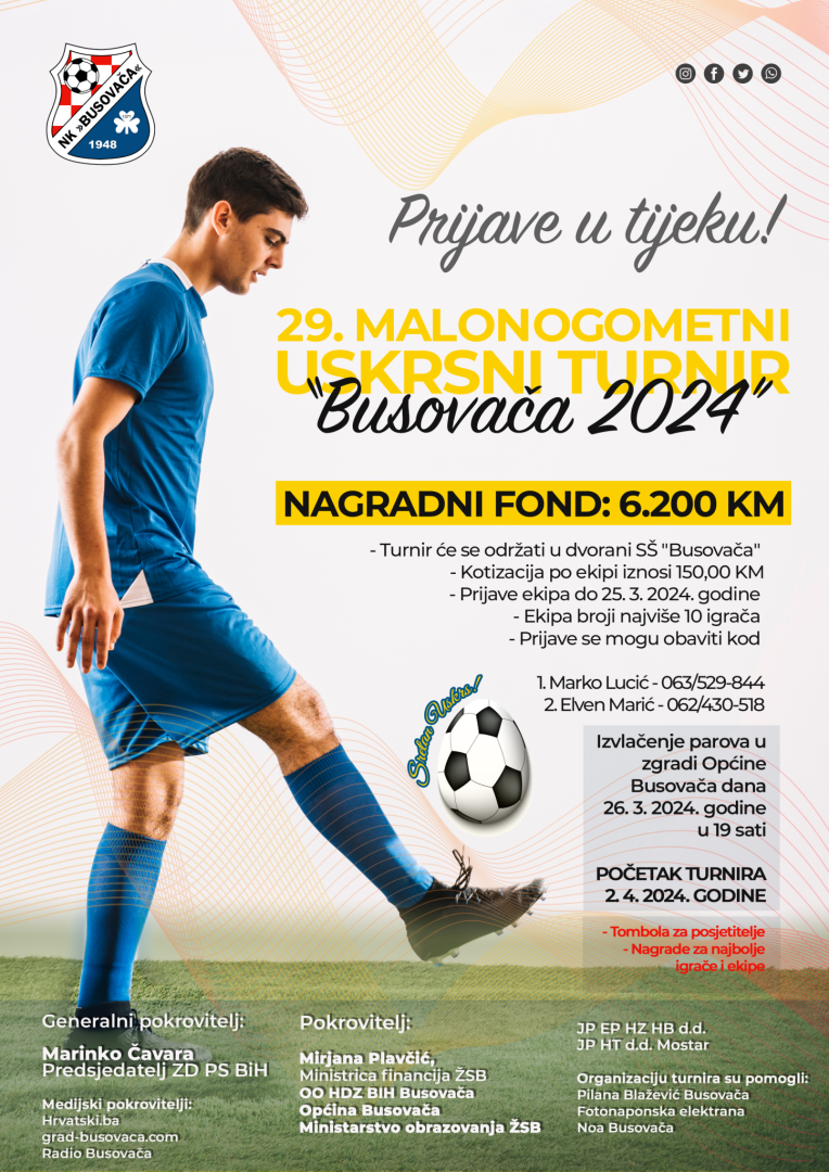 Nogometni klub “Busovača” s ponosom najavljuje održavanje 29. izdanja tradicionalnog malonogometnog uskrsnog turnira „Busovača 2024“. Ovogodišnji turnir obećava uzbudljivo natjecanje s bogatim nagradnim fondom od ukupno 6.200,00 KM.