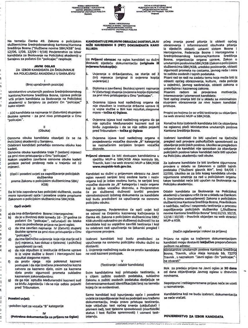 Prijave u tijeku: MUP KSB zapošljava 100 policajaca
