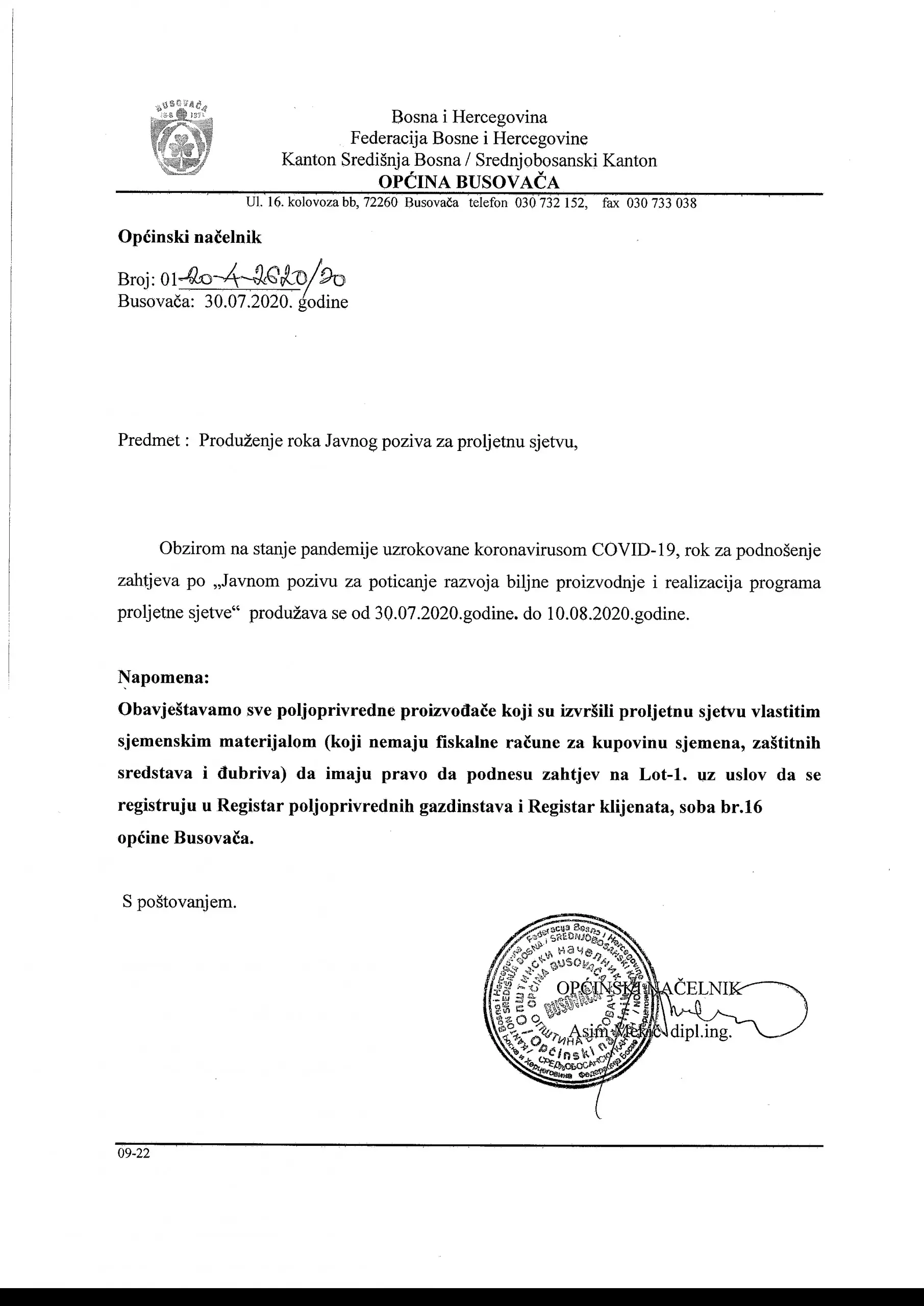 Obzirom na stanje pandemije uzrokovane korona virusom COVID-19, rok za podnošenje zahtjeva po “Javnom pozivu za poticaje razvoja biljne proizvodnje i realizacija programa proljetne sjetve” produžžava se od 30.07.2020. godine do 10.08.2020. godine.