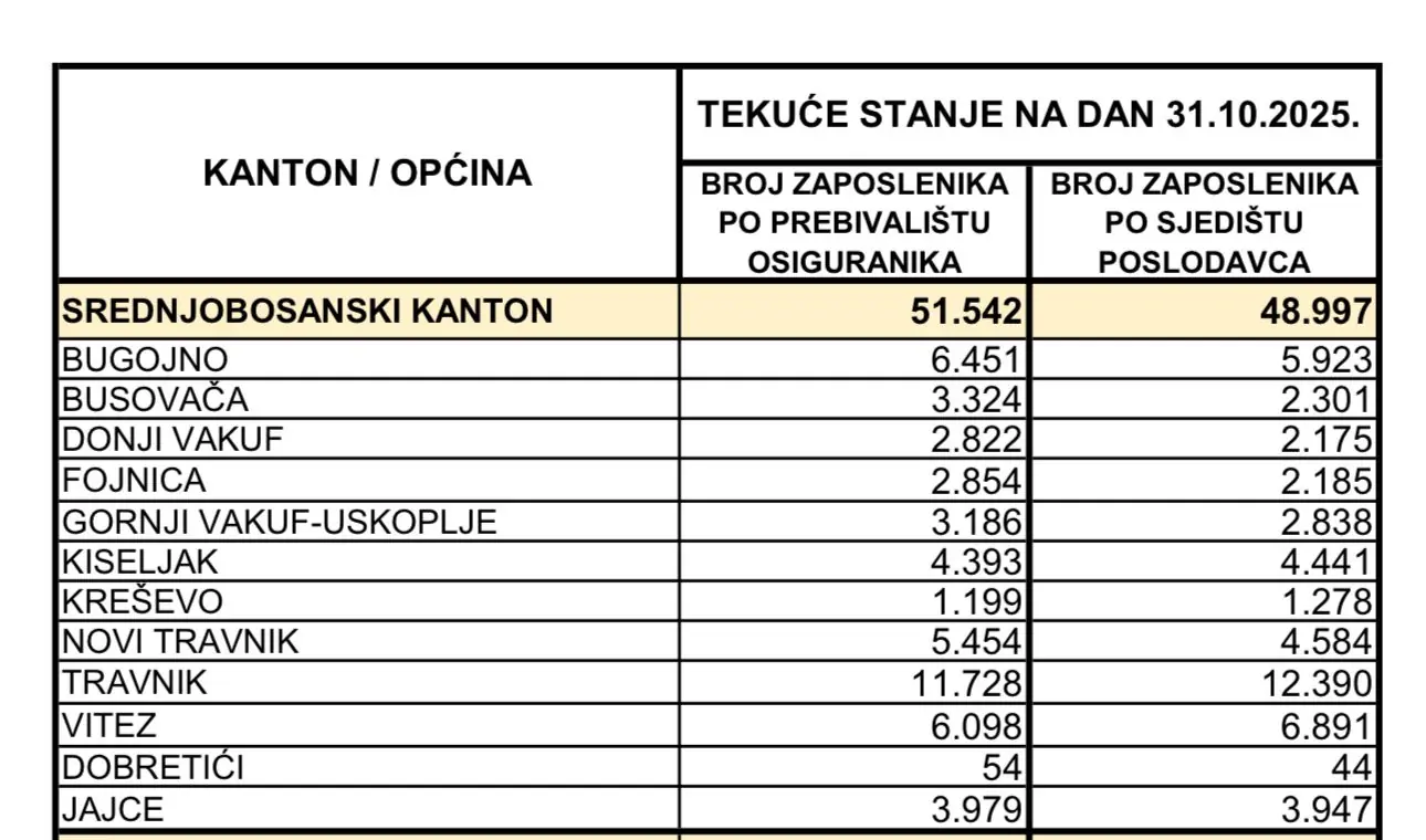 Ukupno gledano, broj zaposlenih u Federaciji BiH nastavlja rasti. Na dan 31. listopada evidentirano je 547.520 zaposlenih, što je 455 osoba više nego mjesec ranije. Od tog broja 55,53% su muškarci, a 44,47% žene, dok više od trećine zaposlenih čine osobe mlađe od 35 godina, što ukazuje na stabilan priljev mlađe radne snage i na lokalnim tržištima poput Busovače.