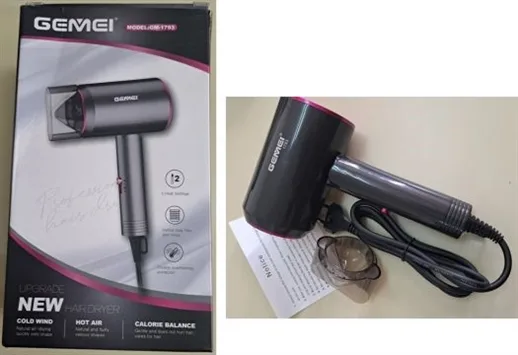 Drugi model fena za kosu je “Gemei/” tip GM-1793 i on predstavlja opasnost od strujnog udara i požara zato što je površina poprečnog presjeka provodnika u napojnom kablu manja od minimalno dozvoljene, njegova ulazna snaga nije u propisanim granicama.