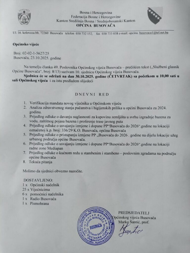 Na temelju članka 49. Poslovnika Općinskog vijeća Busovača – prečišćen tekst („Službeni glasnik Općine Busovača“, broj: 8/13) sazvana je 10. sjednica Općinskog vijeća Busovača.