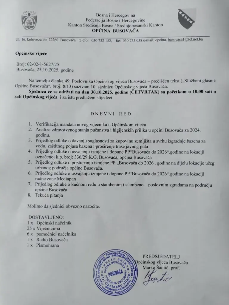 Na temelju članka 49. Poslovnika Općinskog vijeća Busovača – prečišćen tekst („Službeni glasnik Općine Busovača“, broj: 8/13) sazvana je 10. sjednica Općinskog vijeća Busovača.