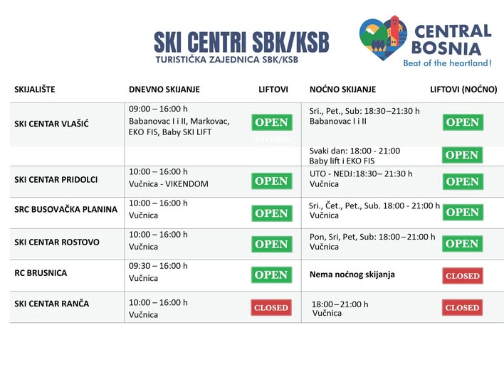 Turistička zajednica Kantona Središnja Bosna objavila je najnovije informacije o radu ski-centara na području KSB-a. Ljubiteljima zimskih sportova na većini skijališta trenutno je na raspolaganju dnevno i noćno skijanje, uz napomenu da se stanje može mijenjati ovisno o vremenskim uvjetima.