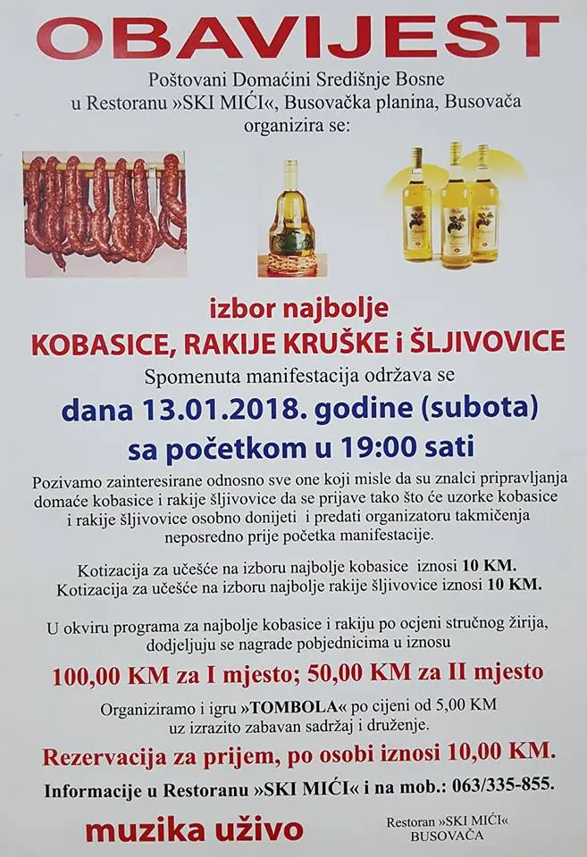U vrhunskom gastronomskom i glazbenom ozračju biraju se po tri najbolja “domaćina” iz svake kategorije. Podsjećanja radi, prošle godine najzadovoljniji su bili pobjednici Mario Milinović iz Busovače, Ivica Semren i Jozo Petrović Žika, obojica iz Viteza (kobasice), Miroslav Bošnjak Ćiro, Marko Vrhovac i Ivan Laštro, sva trojica iz Busovače (šljivovica), i Darko Franjić iz Viteza, Josip Subašić i Zoran Petrović, obojica iz Busovače (viljemovka).