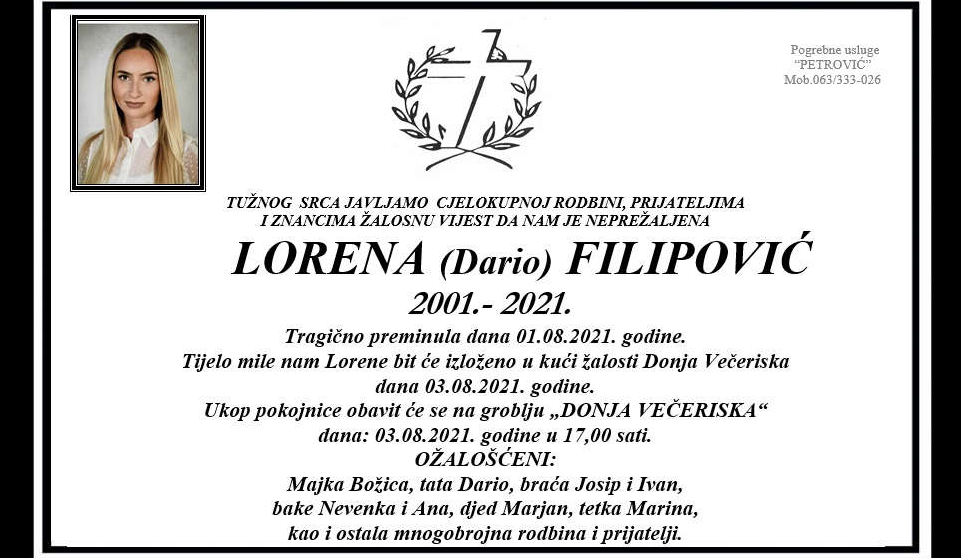 Tijelo mile pokojnice bit će izloženo u kući žalosti u Donjoj Večeriskoj dana 3. kolovoza 2021. Ukop će se obaviti na groblju Donja Večeriska istoga dana u 17:00 sati.