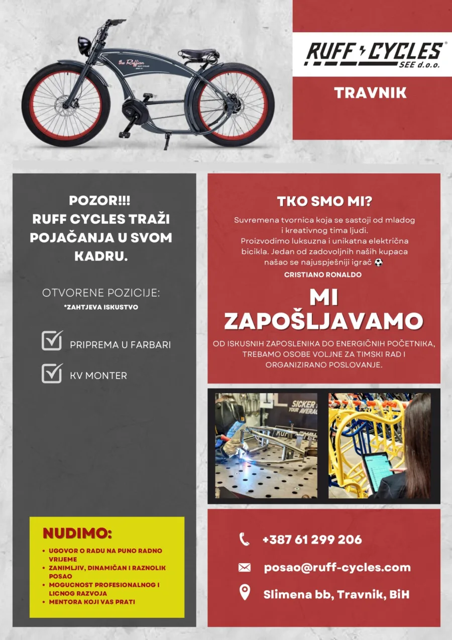 Ruff Cycles SEE d.o.o. Travnik zapošljava radnike na dvije pozicije.