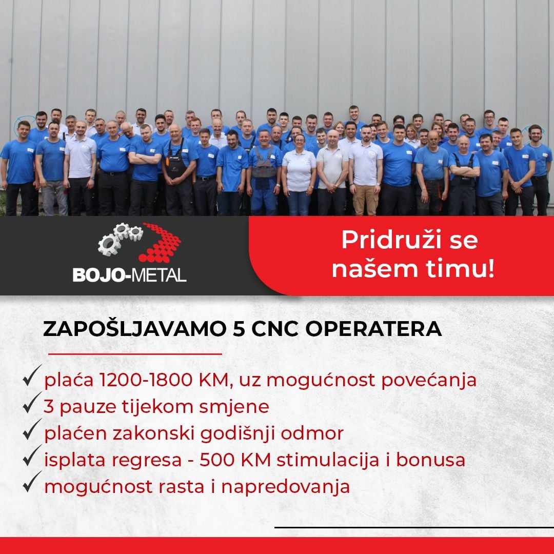 Zbog povećanja obima posla tvrka BOJO METAL u Kiseljaku zaopšljava 5 cnc operatera!