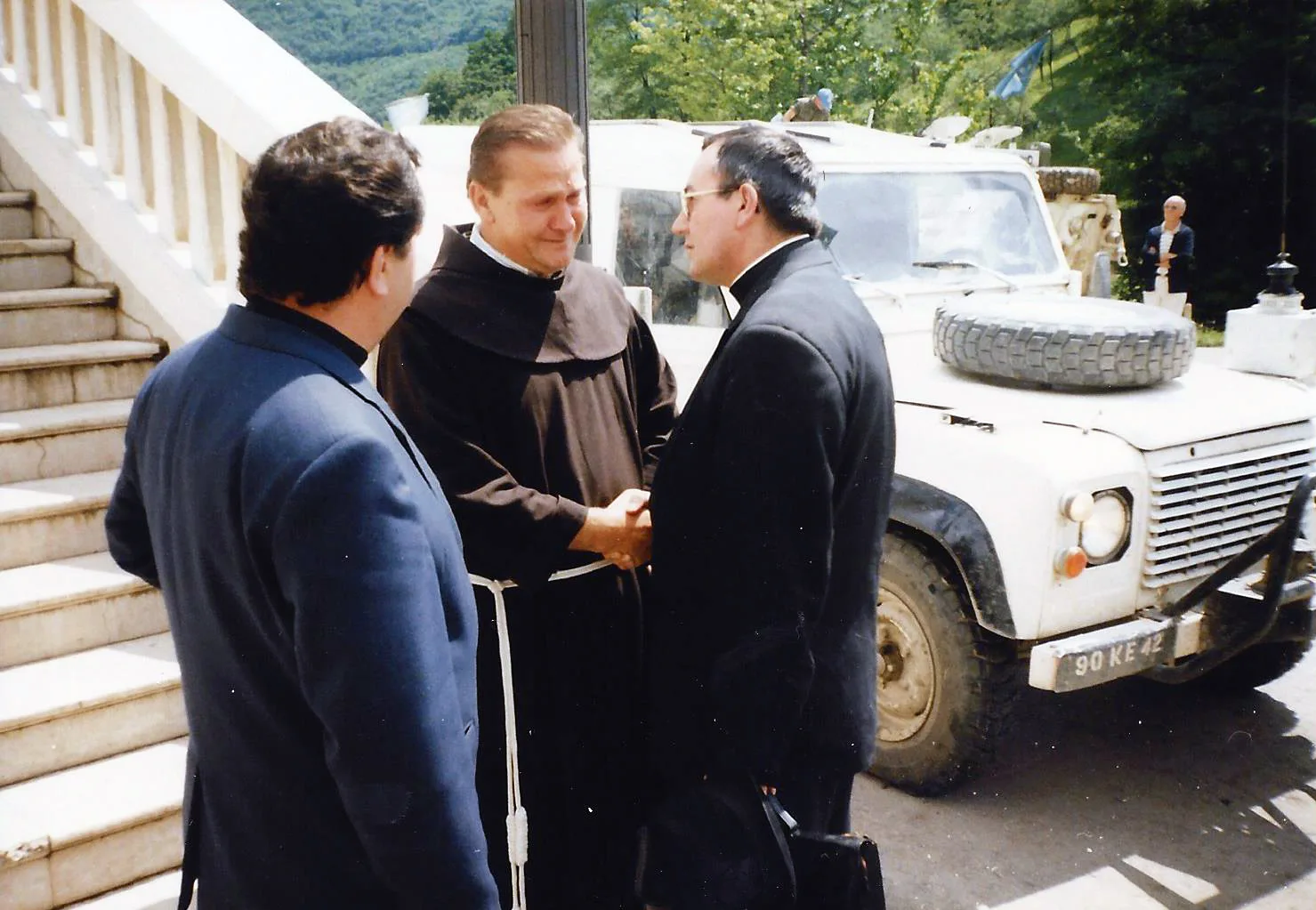 Fra Stjepan Duvnjak, gvardijan franjevačkog samostana u Kraljevoj Sutjesci, sa suzama u očima dočekao je 18. 6. 1993., vrhbosanskog nadbiskupa Vinka Puljića, nakon što je većina sutješkog naroda prognana. Ispred stoji preč. Petar Jukić, tadašnji župnik u Kaknju, prenosi Svjetlo riječi.