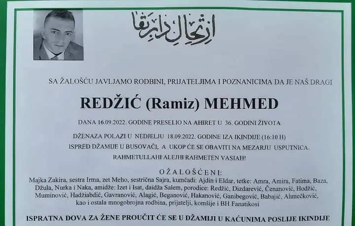 Dženaza za preminulog Mehmeda polazi 18 rujna iza ikindije (16:00 sati), ispred džamije u Busovači.