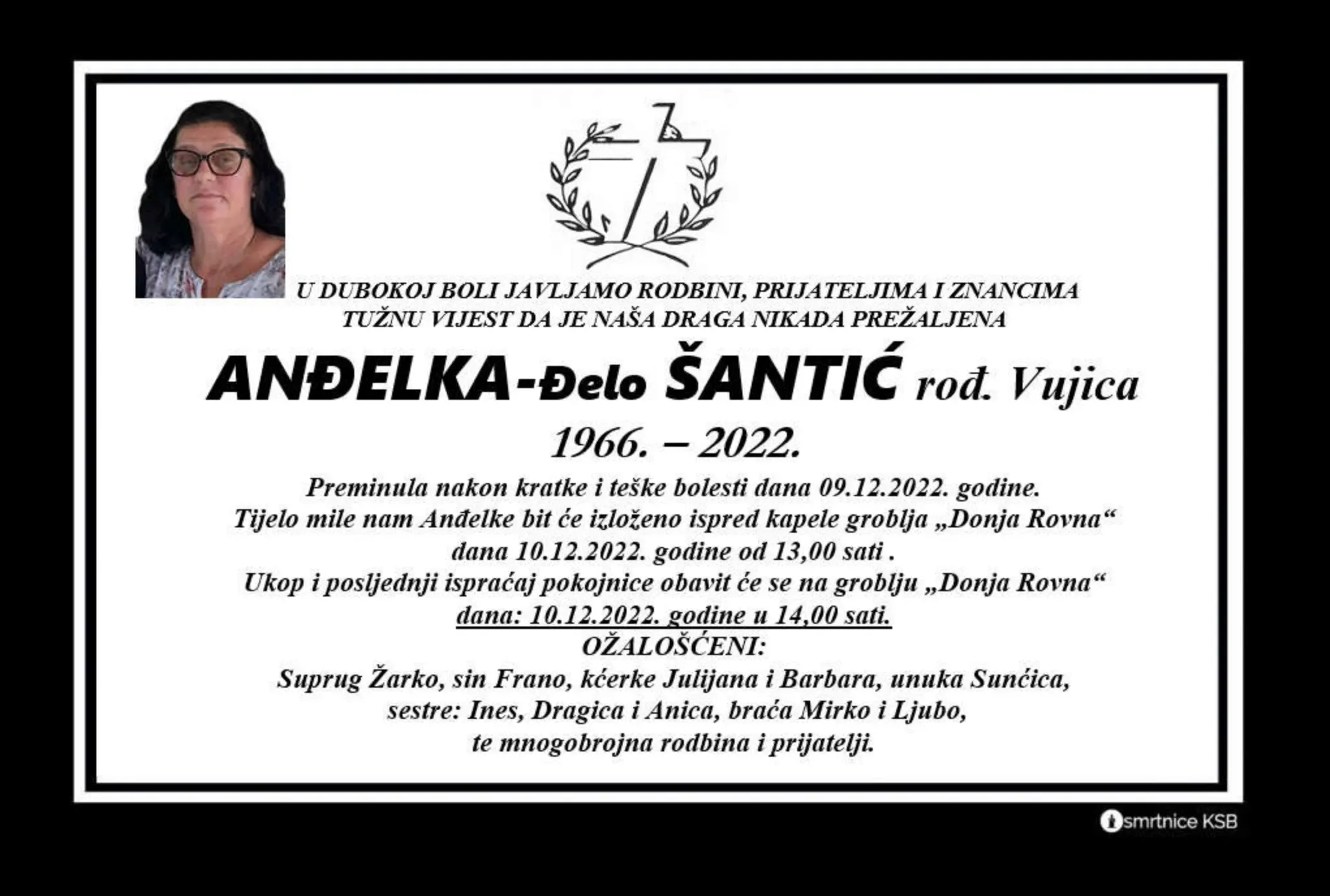 Tijelo mile nam Anđelke bit će izloženo ispred kapele groblja “Donja Rovna” dana 10. 12. 2022. godine od 13 sati. Ukop i posljednji ispraćaj obavit će se na groblju “Donja Rovna” dana 10. 12. 2022. godine u 14 sati.