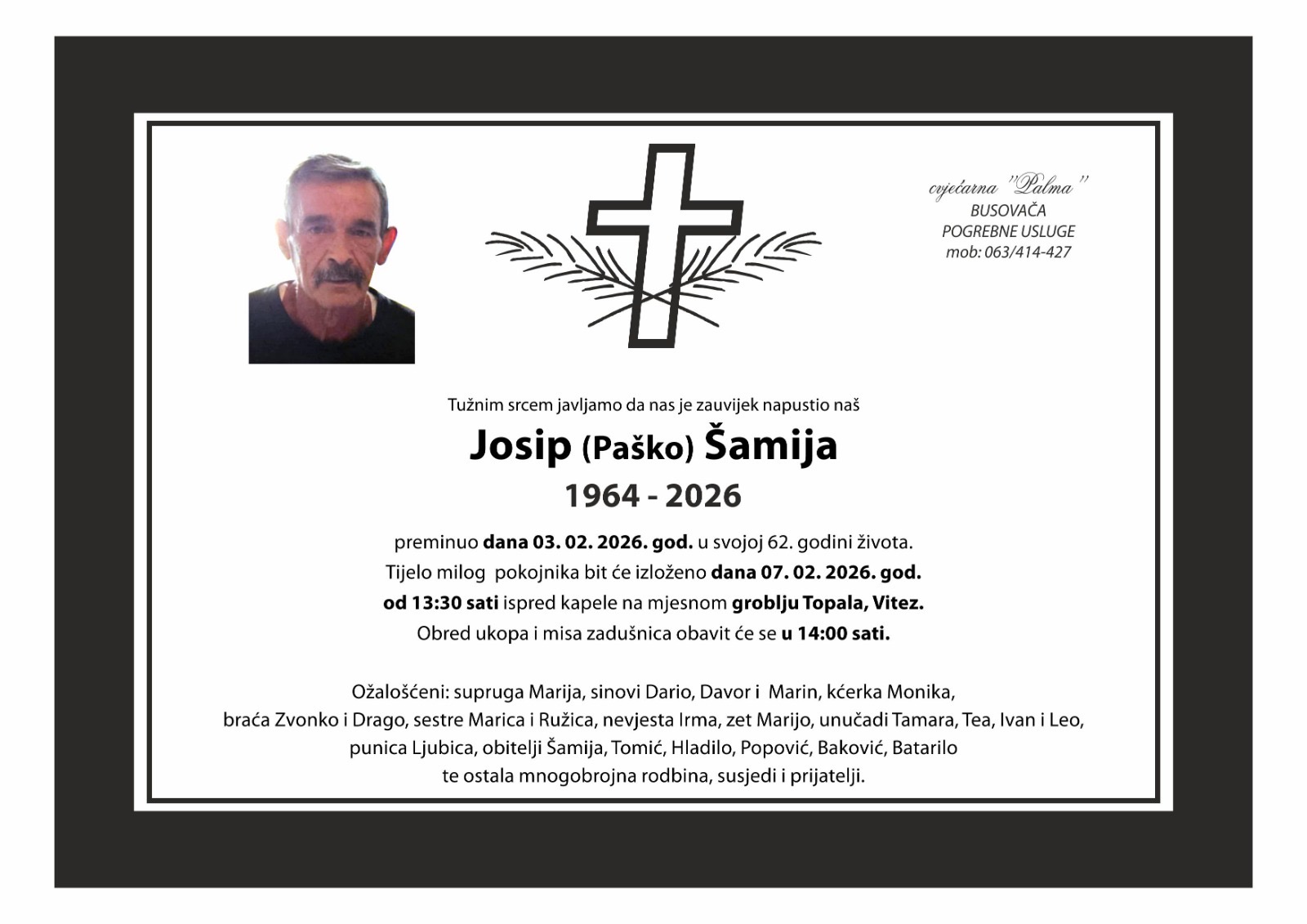 Tijelo milog pokojnika bit će izloženo 07. 02. 2026. godine od 13:30 sati ispred kapele na mjesnom groblju Topala, Vitez.