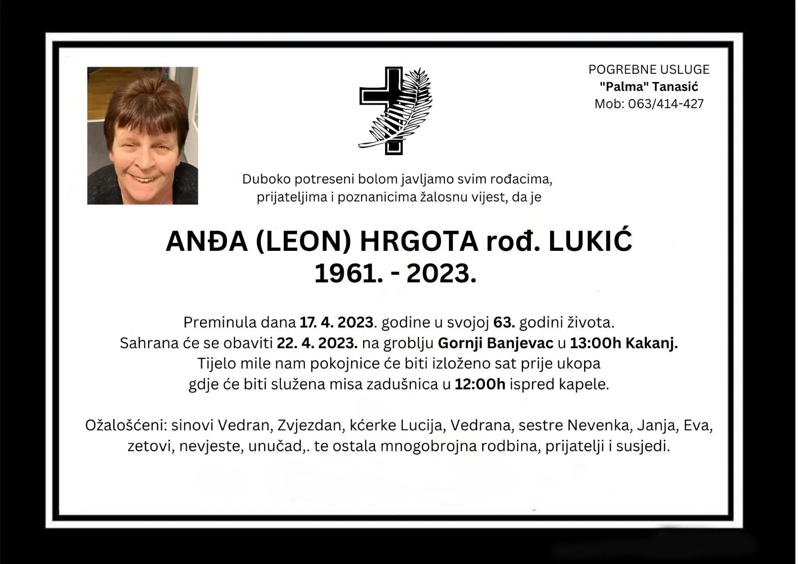 Duboko potreseni bolom javljamo svim rođacima, prijateljima i znancima žalosnu vijest da je Anđa (Leon) Hrgota rođ. Lukić