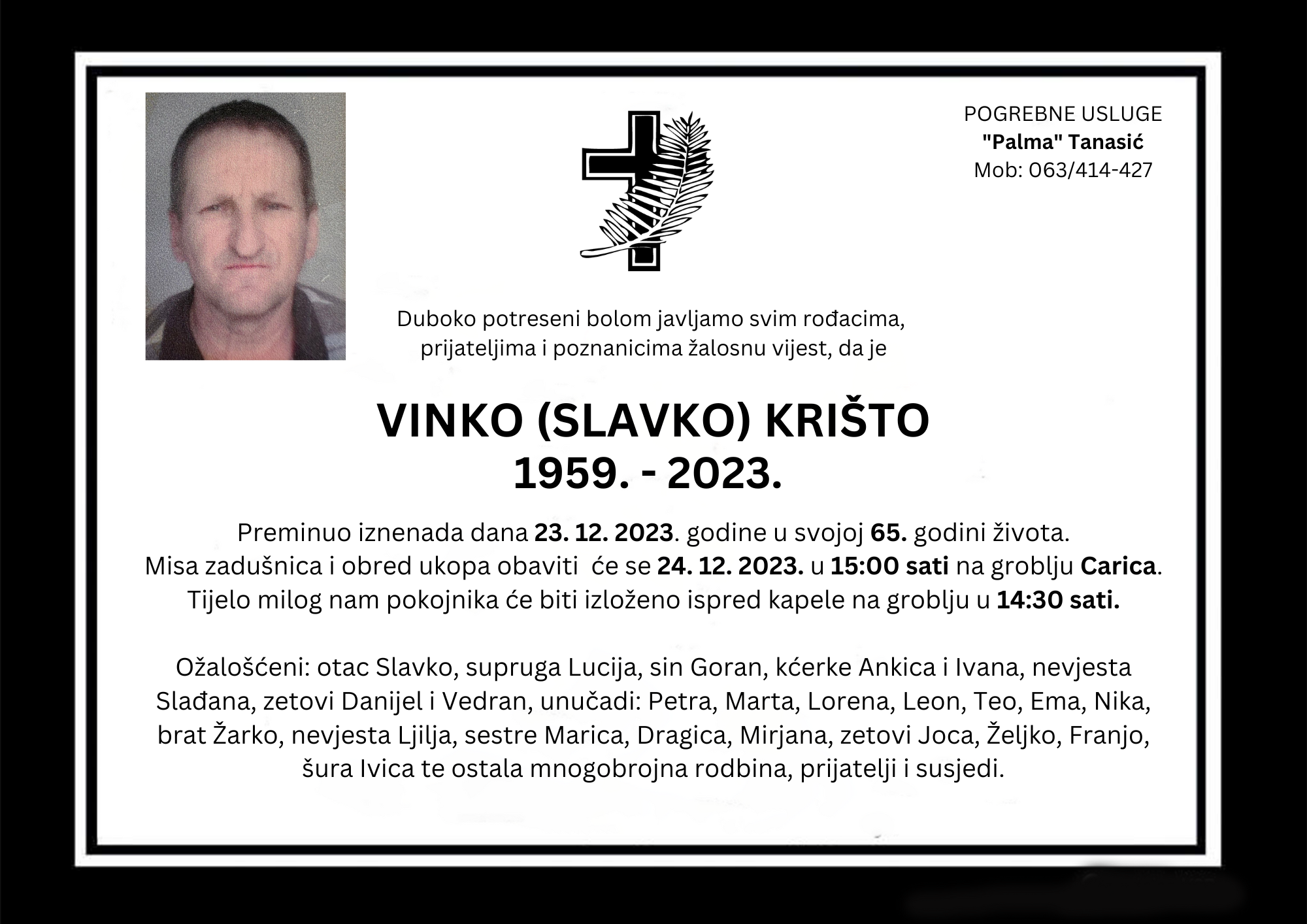 Duboko potreseni bolom javljamo svim rođacima, prijateljima i poznanicima žalosnu vijest, da je VINKO (SLAVKO) KRIŠTO preminuo iznenada dana 23. 12. 2023. godine u svojoj 65. godini života.