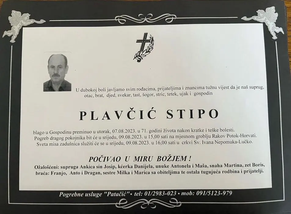 U dubokoj boli javljamo svim rođacima, prijateljima i znancima tužnu vijest da je naš suprug, otac, brat, djed, svekar, tast, šogor, stric, tetak, ujak i gospodin Plavčić (Pavo) Stipo blago u Gospodinu preminuo u utorak, 7. kolovoza 2023. godine u 71. godini života nakon kratke i teške bolesti.