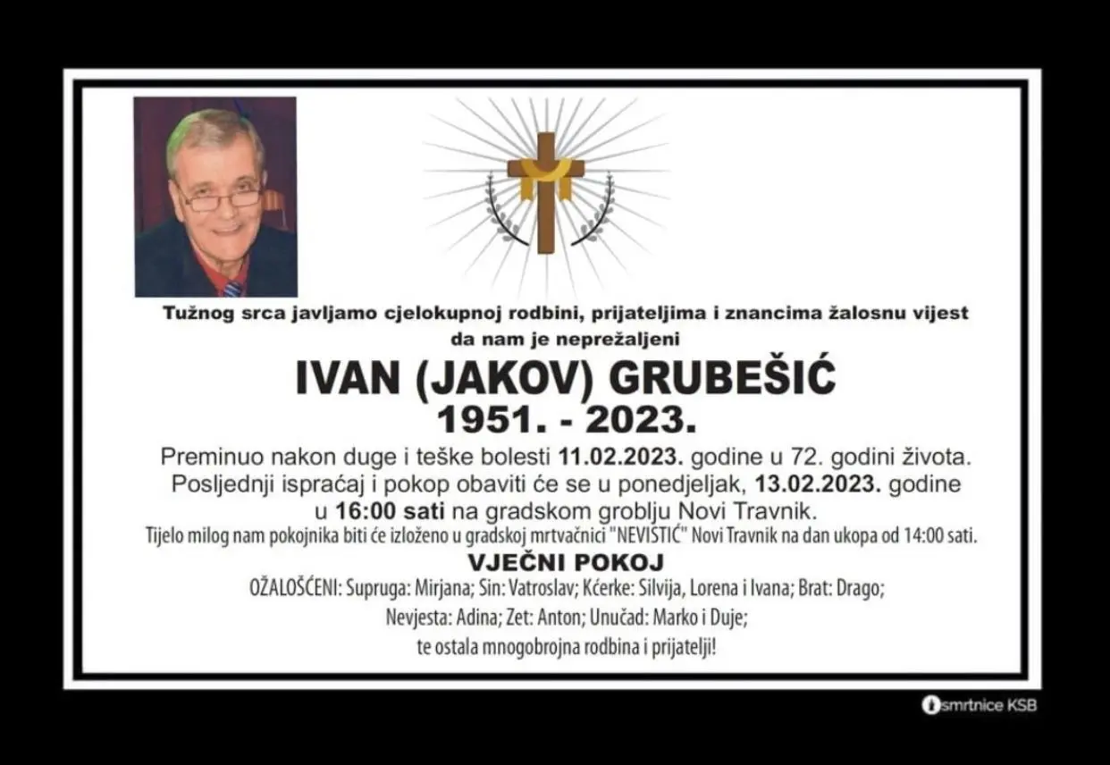 Umro je Ivan Grubešić, poznati pravnik iz Novog Travnika. U svojoj karijeri obavljao je mnoge pravničke poslove, a u posljednje vrijeme bavio se odvjetništvom.