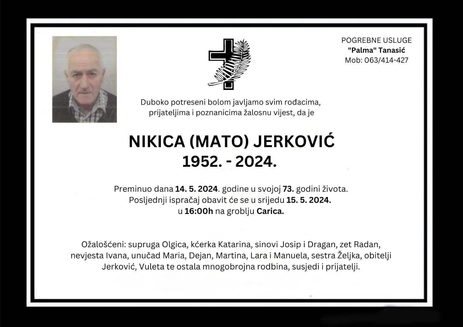 Ožalošćeni: supruga Olgica, kćerka Katarina, sinovi Josip i Dragan, zet Radan, nevjesta Ivana, unučad Maria, Dejan, Martina, Lara i Manuela, sestra Željka, obitelji Jerković, Vuleta te ostala mnogobrojna rodbina, susjedi i prijatelji.