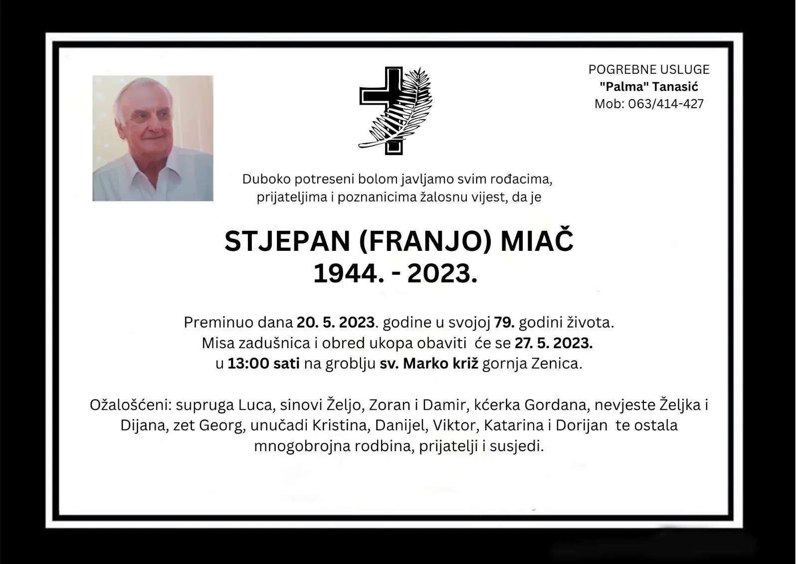 Misa zadušnica i obred ukopa obaviti će se 27. 5. 2023. u 13:00 sati na groblju sv. Marko križ gornja Zenica.