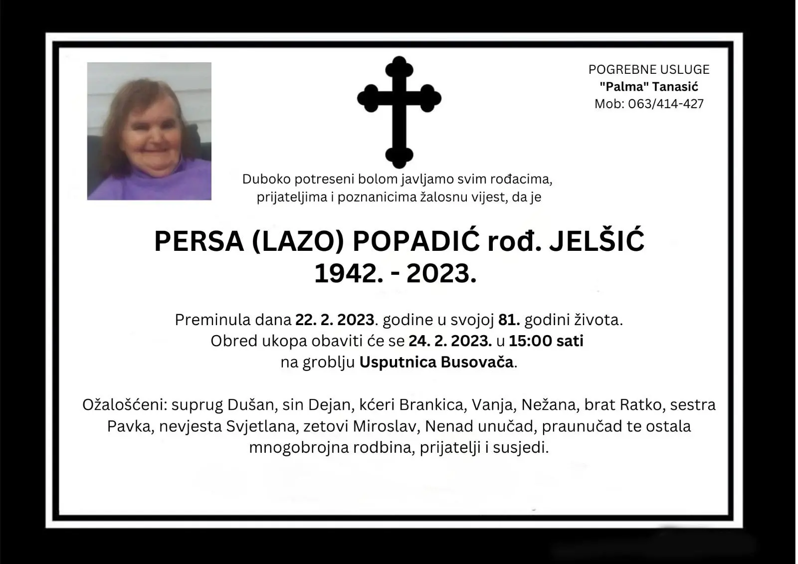 Duboko potreseni bolom javljamo svim rođacima, prijateljima i znancima žalosnu vijest, da je Persa Popadić rođ. Jelšić preminula dana 22. veljače 2023. godine u svojoj 81. godini života.