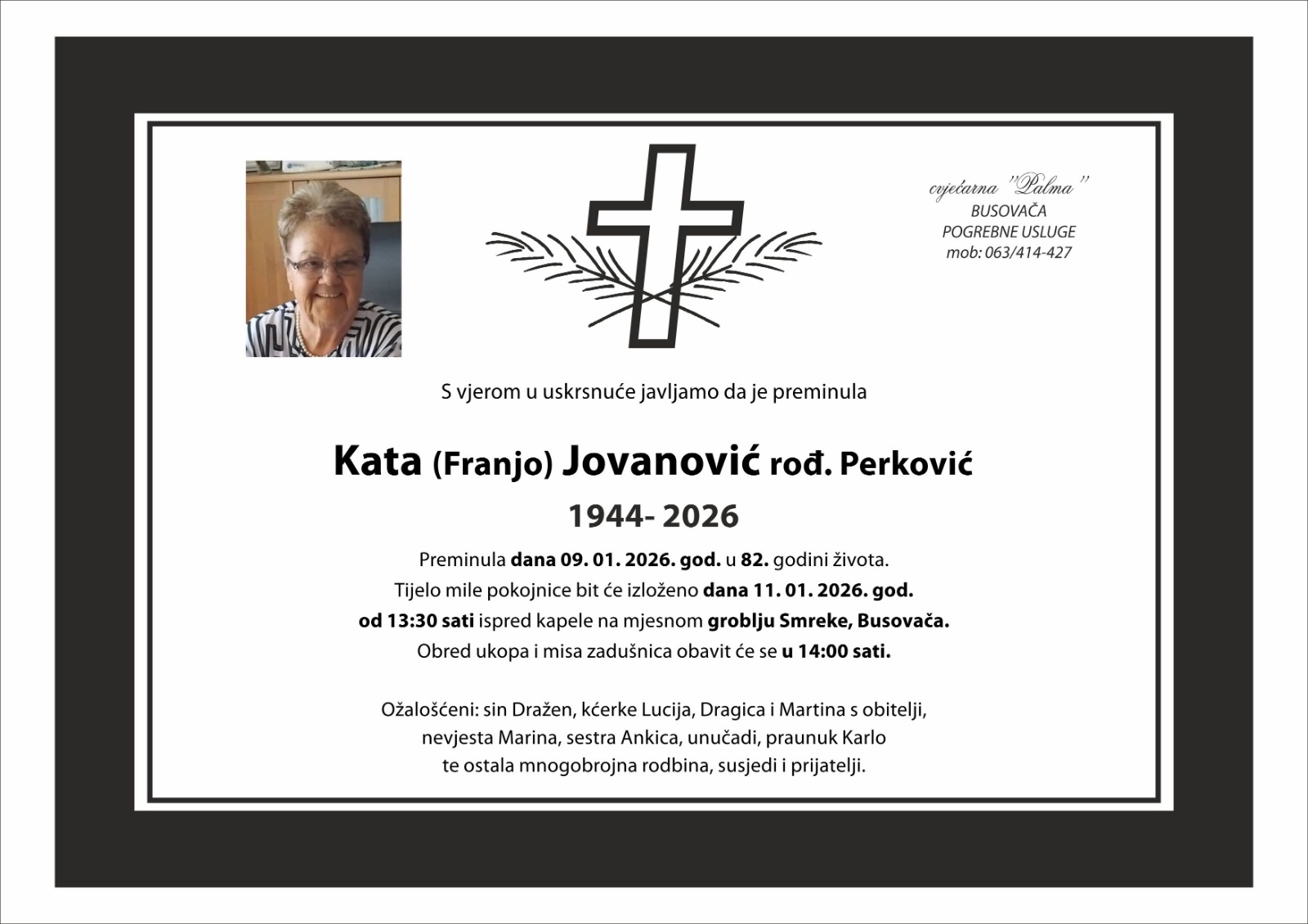 S vjerom u uskrsnuće javljamo da je preminula Kata (Franjo) Jovanović rod. Perković (1944.- 2026).
